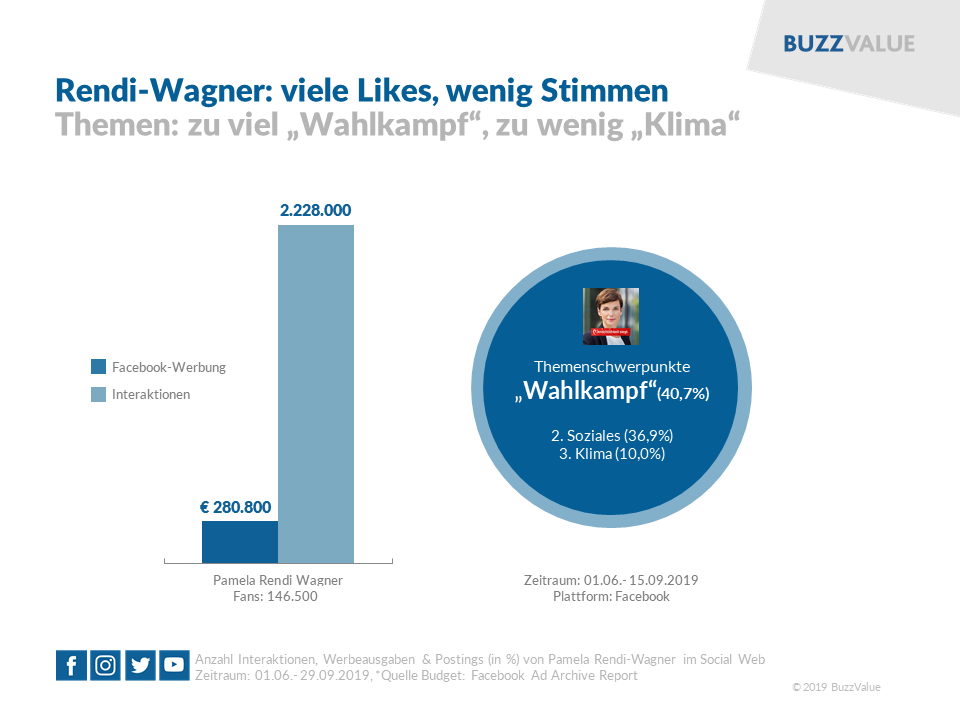 Mit rund 2,2 Mio. Interaktionen auf Facebook und Co konnte sich in den vergangenen Monaten Pamela Rendi-Wagner (SPÖ) im Rennen um die meisten Reaktionen, Shares und Kommentare durchsetzen. Den Wahlkampf ließ sich die Spitzenkandidatin der SPÖ auf Facebook auch mehr als € 280.800 kosten. Doch gelang es der SPÖ nicht, die zahlreichen User-Interaktionen auf Facebook und Co auch tatsächlich in Wahlstimmen zu transferieren.