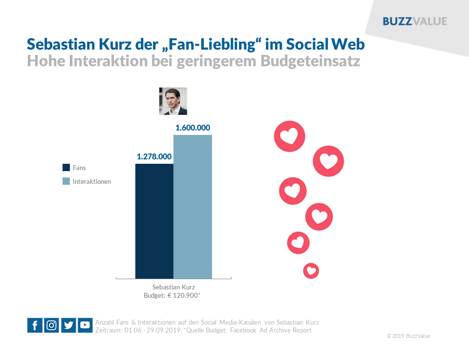 Sebastian Kurz (ÖVP) kann dank seiner großen Anhängerschaft von knapp 1,3 Mio. Fans auf Facebook & Co im Wahlkampf auch umfassend mobilisieren. Insgesamt erzielt er auf seinen Social Media-Kanälen seit Anfang Juni über 1,6 Mio. Fan-Interaktionen. Dabei musste er im Vergleich zur SPÖ und FPÖ auch deutlich weniger Budget (€ 120.900) einsetzen.