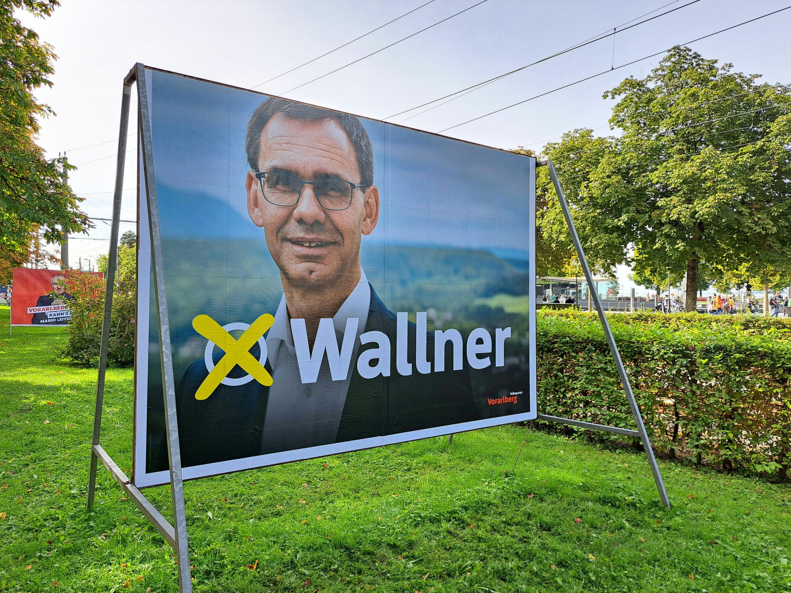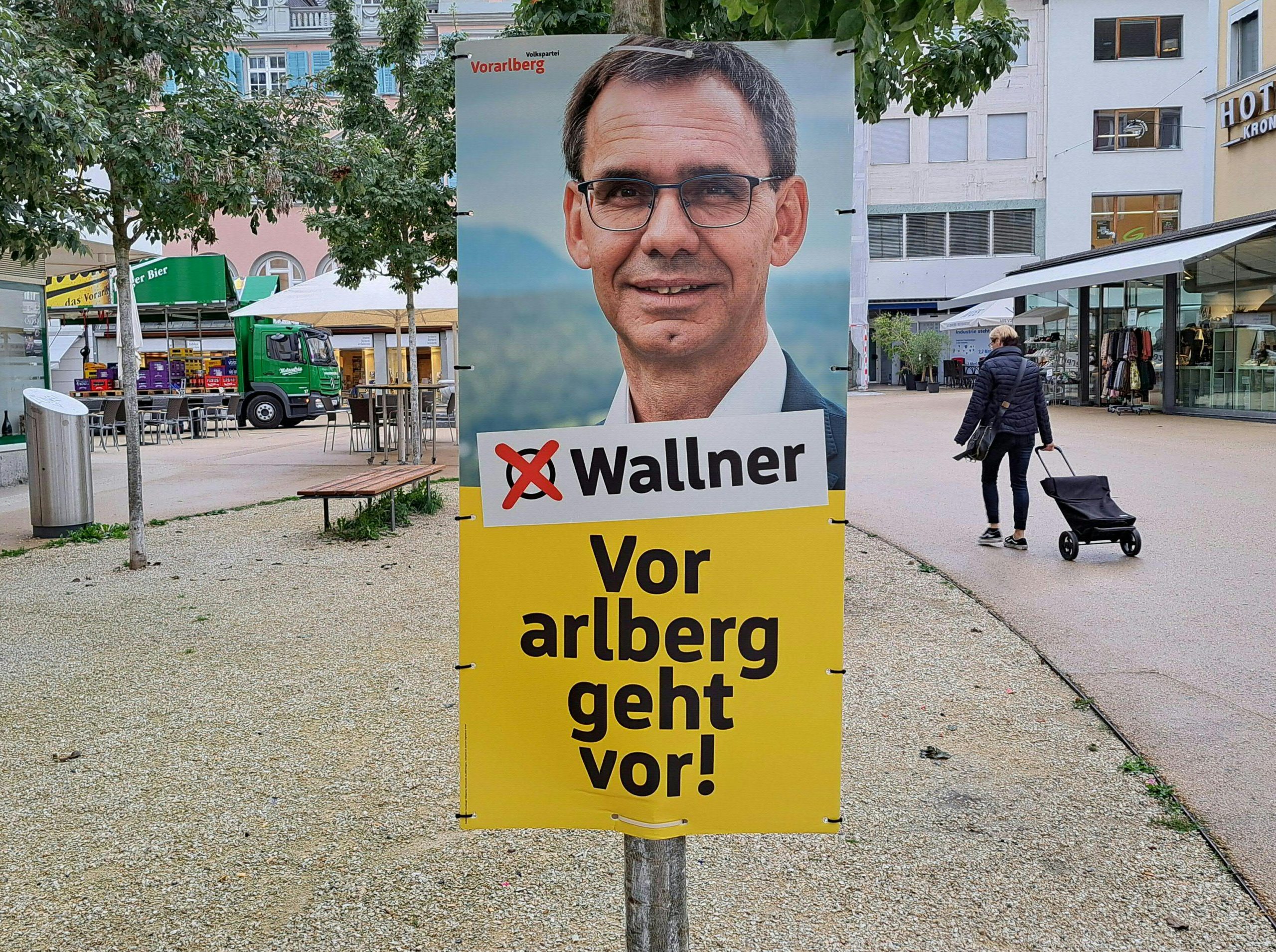 Am Sonntag aber änderte sich das Bild. Schon am Vormittag gab es Großplakate zu sehen, die ÖVP-Spitzenkandidat Markus Wallner zeigen. Außer dem Porträt des Landeshauptmanns ist der Schriftzug "Wallner" - verbunden mit einem "Wahl-x" - zu sehen. Außerdem wirbt er mit dem ÖVP-Wahlslogan "Vorarlberg geht vor!" um Stimmen, auch wenn dieser zunächst noch nicht auf allen Großplakaten angebracht war.