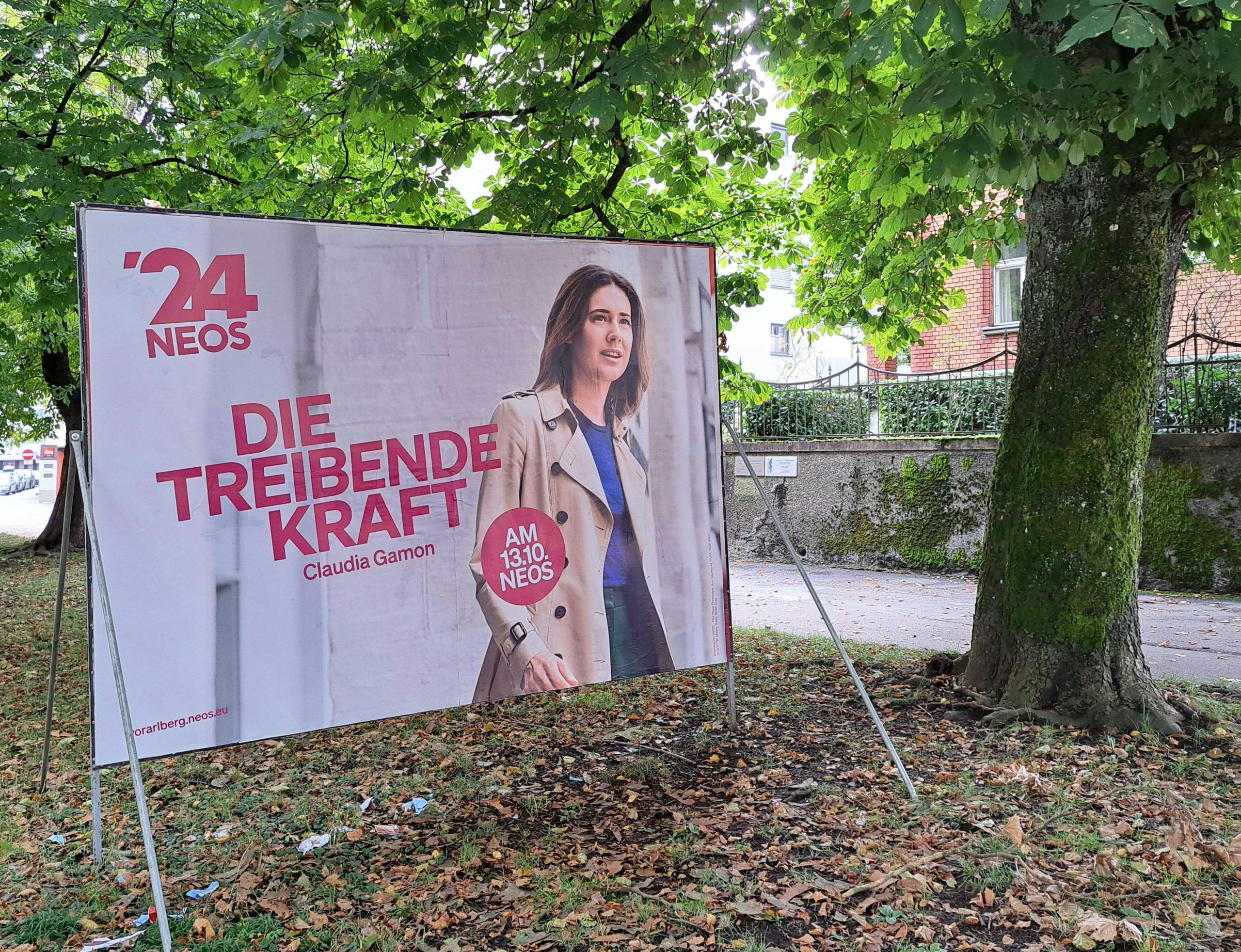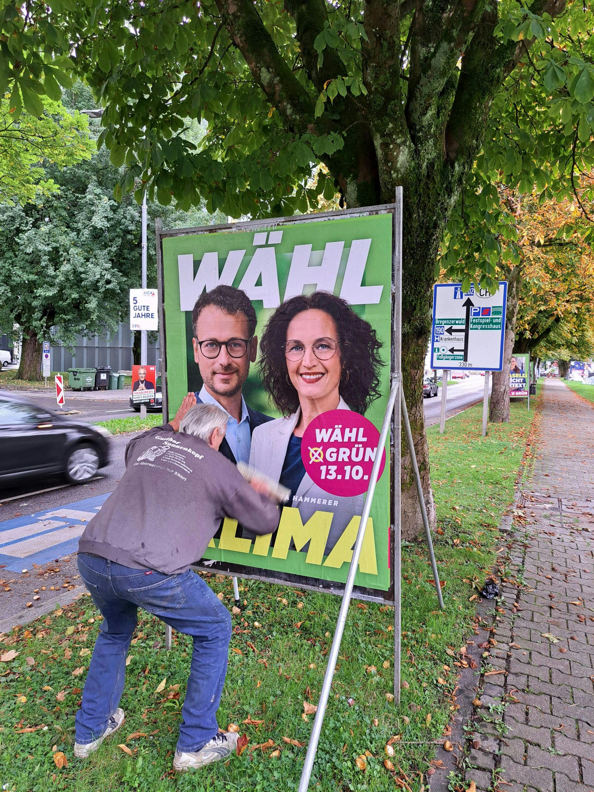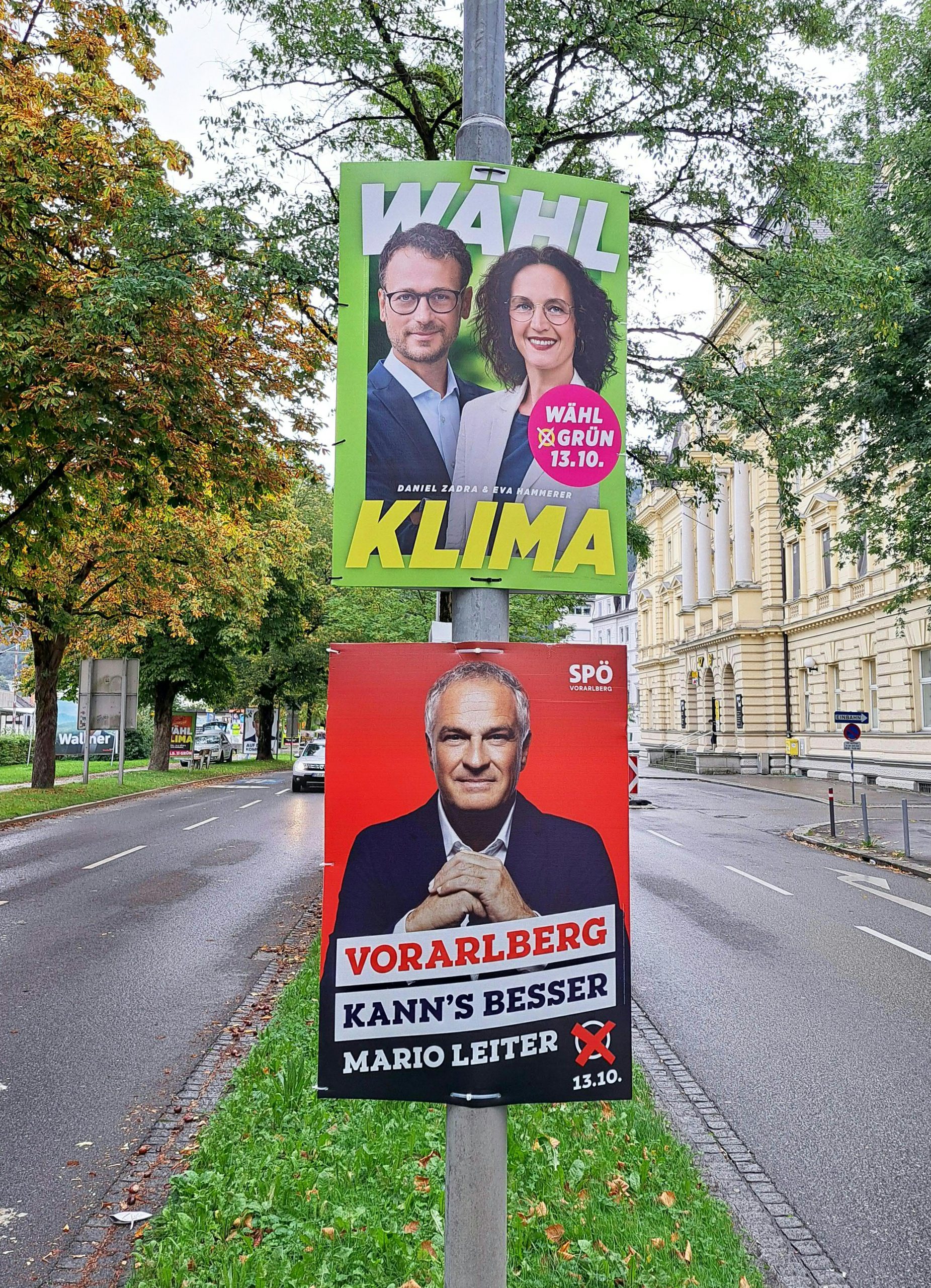 Im Lauf des Tages tauchten neben den Wahlplakate von FPÖ-Spitzenkandidat Christof Bitschi, auch jene der NEOS-Listenersten Claudia Gamon ("Die Reformkraft" bzw. "Die treibende Kraft") und der Grünen auf. Auf den Wahlplakaten der Grünen sind zum einen unter dem Titel "Wähl Klima" die beiden Parteichefs Daniel Zadra (Spitzenkandidat bei der Landtagswahl) und Eva Hammerer abgebildet. Zum anderen wurden aber auch thematische Plakate "Ländle schützen, Grün wählen" platziert.