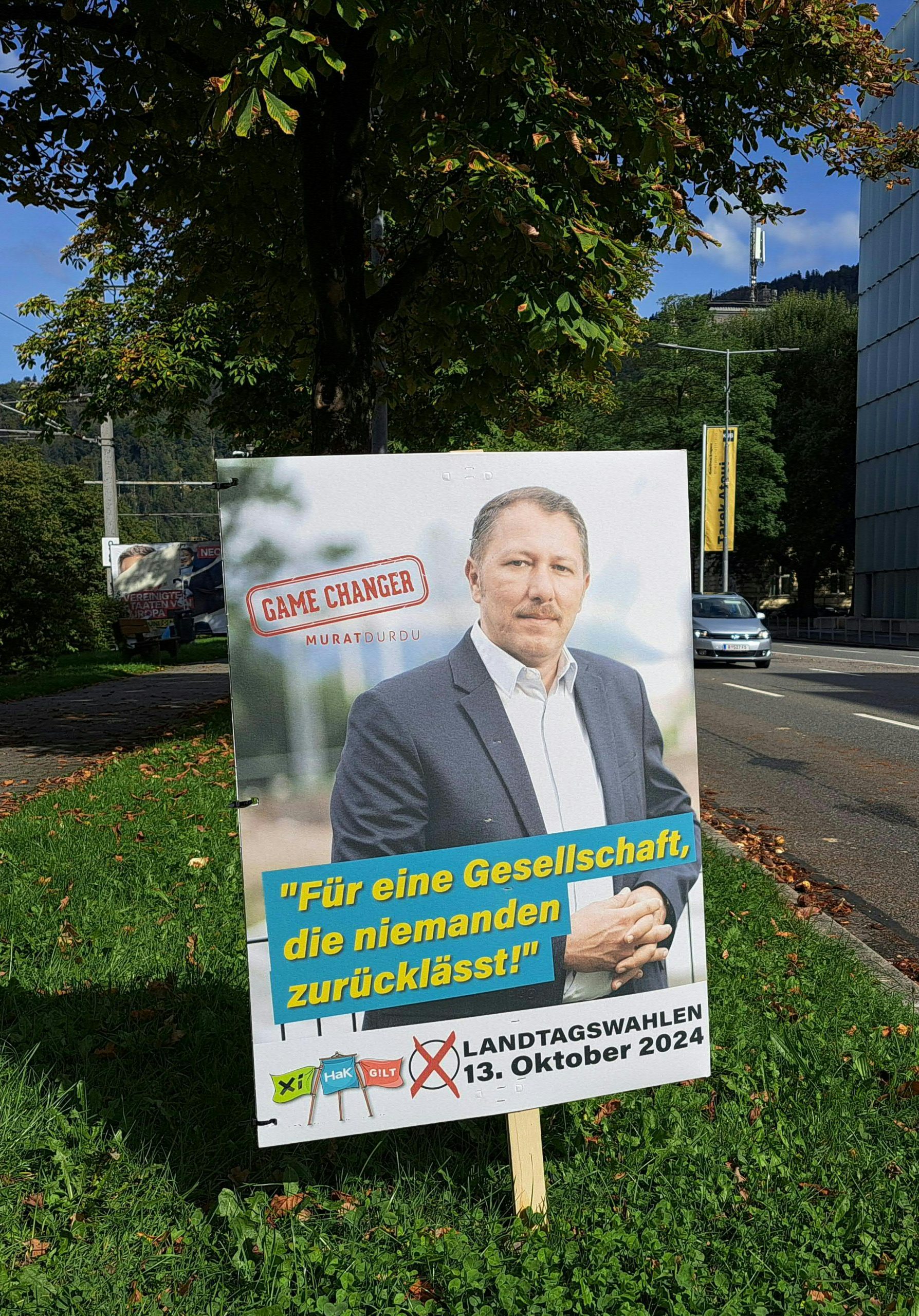 Während bei Wallner ein Datum-Verweis auf den Wahltag fehlt, scheint der 13. Oktober in Form von "13.10." bei allen anderen auf. Bitschi und Gamon werben dafür "auch am 13.10." (Bitschi) bzw. "nochmals" (Gamon) ihre Partei zu wählen. Ebenfalls aufgehängt waren etwa in Bregenz Plakate der Kleinpartei "Xi-HaK-Gilt", die um den Einzug in den Landtag kämpft. Listenzweiter Murat Durdu wirbt dort mit dem Satz "Für eine Gesellschaft, die niemanden zurücklässt".