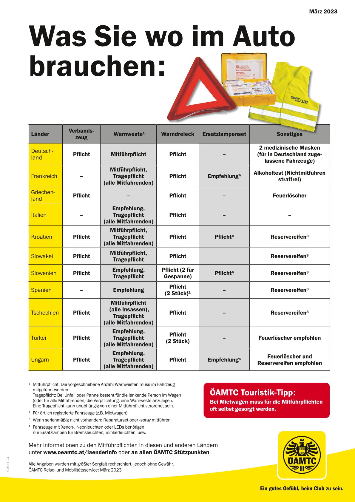 Die nötige Ausstattung, wie z. B. Warndreieck, Warnweste oder auch Feuerlöscher, erhält man an den Stützpunkten des Mobilitätsclubs. Mitglieder bekommen dort zusätzlich auch kostenlos die ÖAMTC Reise-Info-Broschüren für alle europäischen Länder, die sämtliche Mitführpflichten und viele weitere wichtige Infos enthalten.