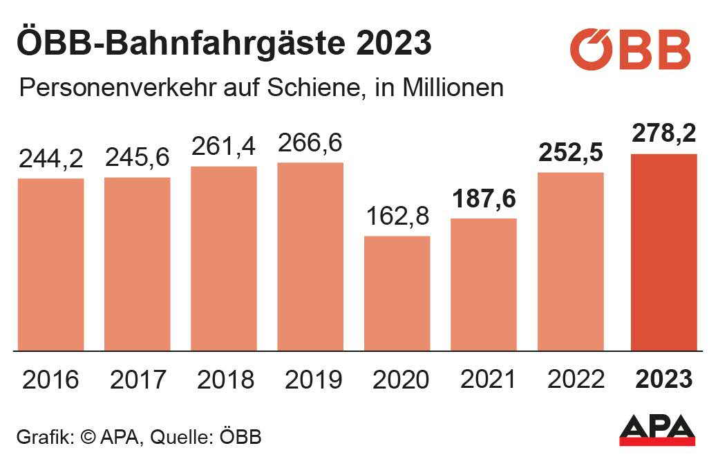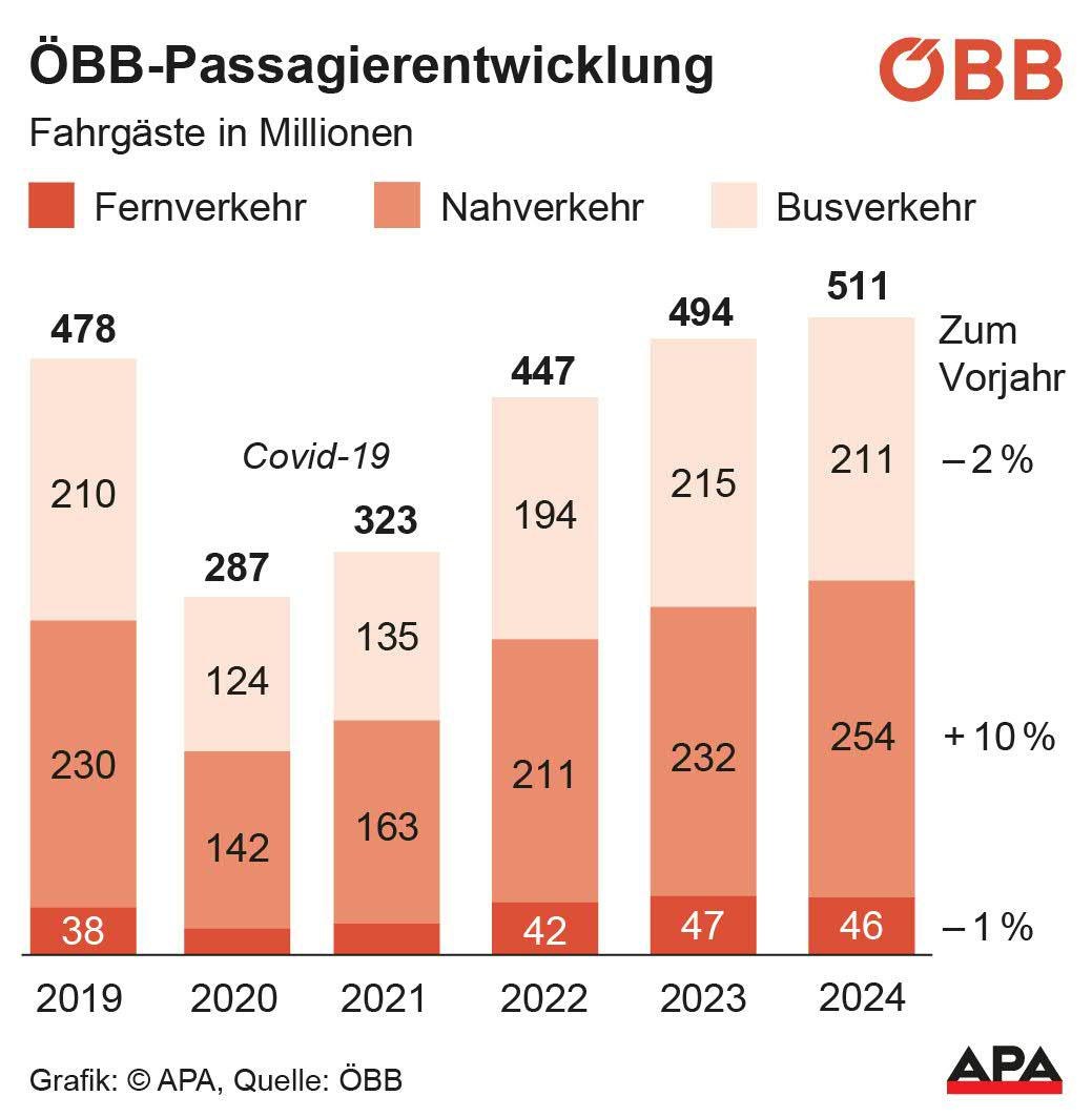 Die Österreichischen Bundesbahnen (ÖBB) haben 2024 erstmals über eine halbe Milliarde Fahrgäste transportiert. 511,3 Mio. Menschen seien im vergangenen Jahr mit ÖBB-Zügen und -Bussen gefahren, teilte das Unternehmen am Freitag mit. Es sei ein herausforderndes Jahr gewesen. "Die Wirtschaftsflaute hat uns ein Stück weit den Wind aus den Segeln genommen", so ÖBB-Chef Andreas Matthä, "und das Hochwasser hat unsere Gleise überschwemmt."