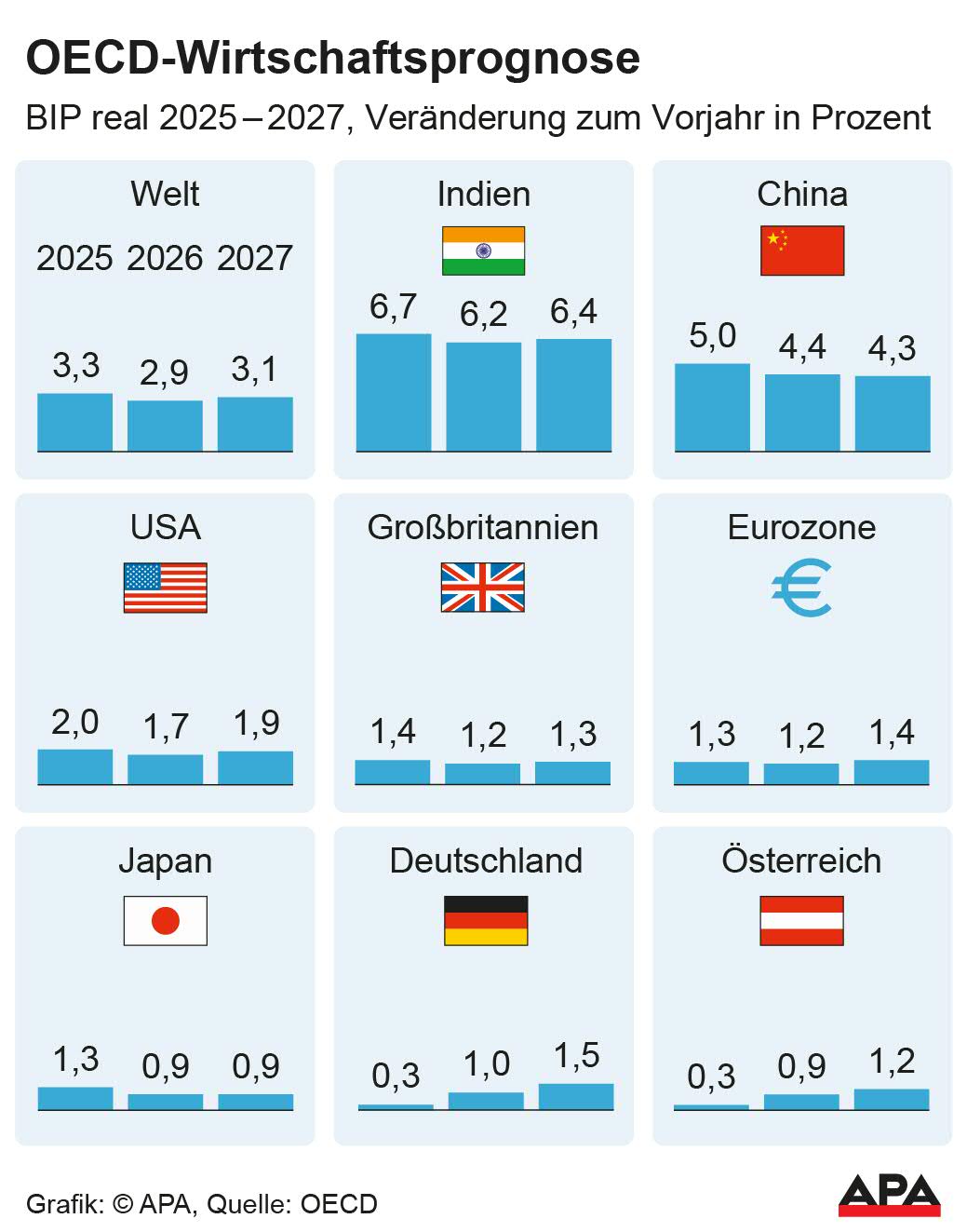 Gebremst wird die wirtschaftliche Erholung durch die anhaltende Haushaltskonsolidierung. So soll das Defizit bis 2028 auf unter 3 Prozent gesenkt werden. Die Konsolidierung werde jedoch die Nachfrage leicht belasten, mutmaßt die OECD in ihrem Ausblick. Schließlich muss Österreich nach Ansicht der Ökonomen auf Herausforderungen wie die Alterung der Bevölkerung, den Klimawandel und steigende Verteidigungsausgaben reagieren. Dazu sind laut dem Ausblick Reformen der öffentlichen Finanzen nötig - etwa beim Rentensystem oder den Sozialleistungen.