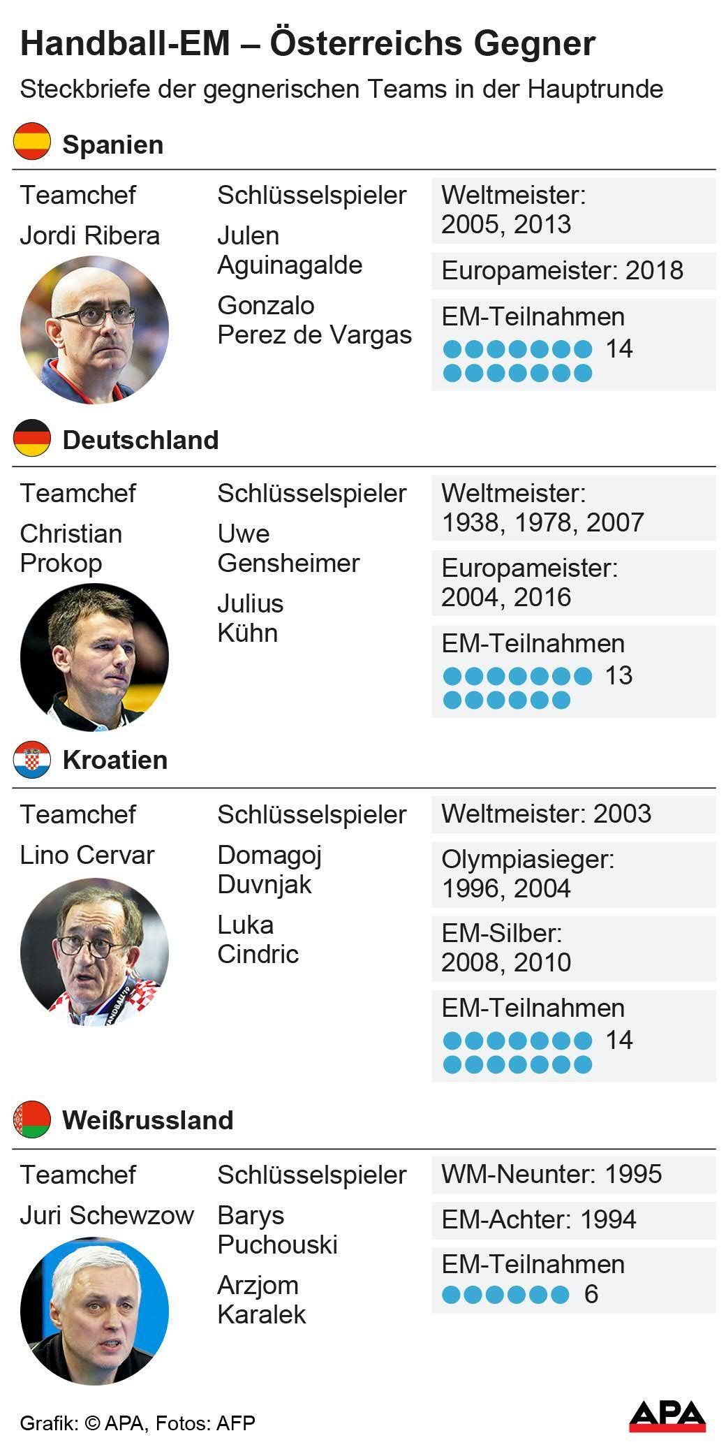 Am Donnerstag wird das freilich keine Rolle spielen, auch die recht knappen Vergleiche zwischen Österreich und Kroatien aus der jüngeren Vergangenheit sind dann ohne Belang. Bei der Heim-EM 2010 unterlag Rot-Weiß-Rot in der Hauptrunde ebenfalls in Wien 23:26, 2015 bei der WM in Katar in der Vorrunde 30:32. "Das sind eigentlich andere Mannschaften gewesen", meinte Routinier Janko Bozovic, 2015 selbst mit von der Partie.