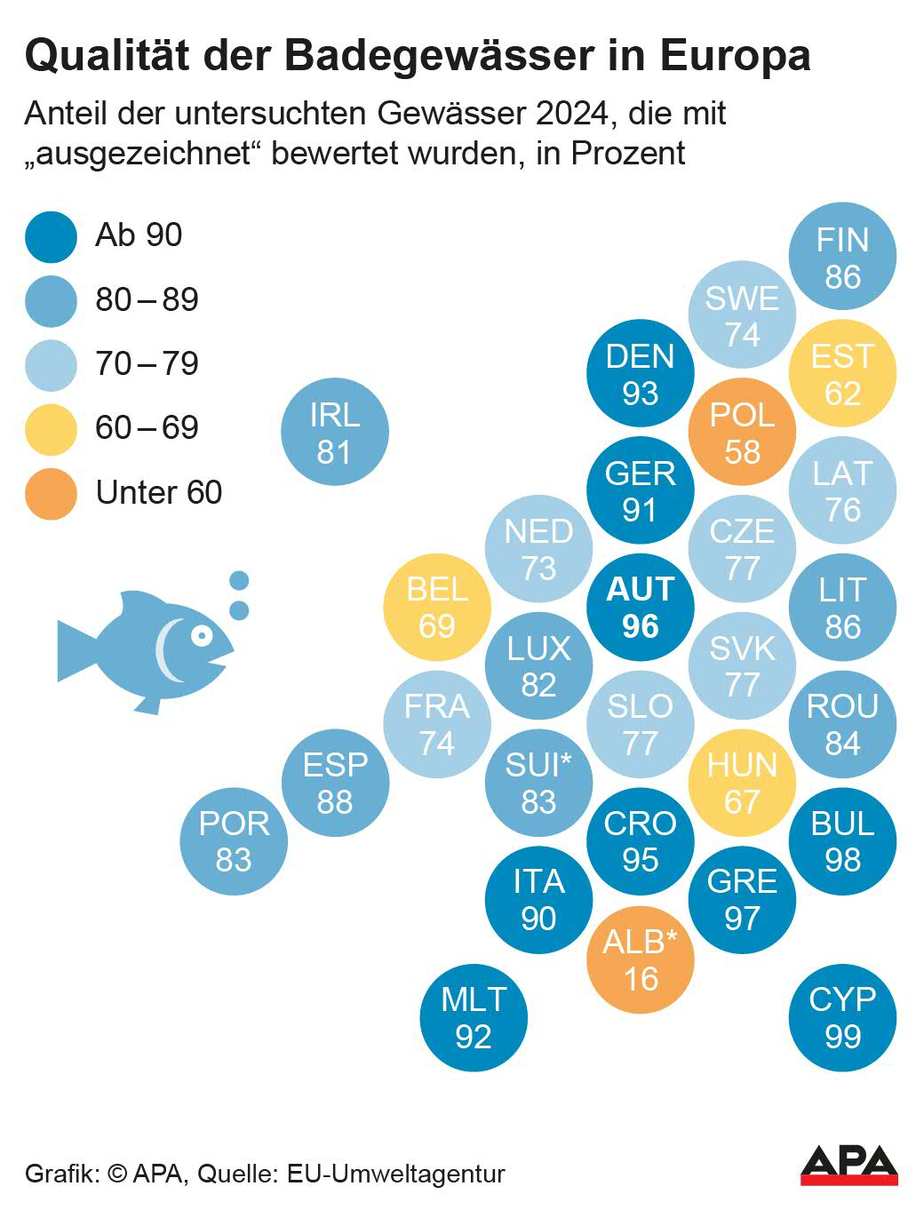 Österreichs Flüsse und Seen weisen weiterhin hohe Wasserqualität auf – dennoch ist das Land im aktuellen EU-Ranking vom zweiten auf den vierten Platz zurückgefallen. Laut dem Bericht der Europäischen Umweltagentur gelten 95,8 Prozent der heimischen Badegewässer als "ausgezeichnet".