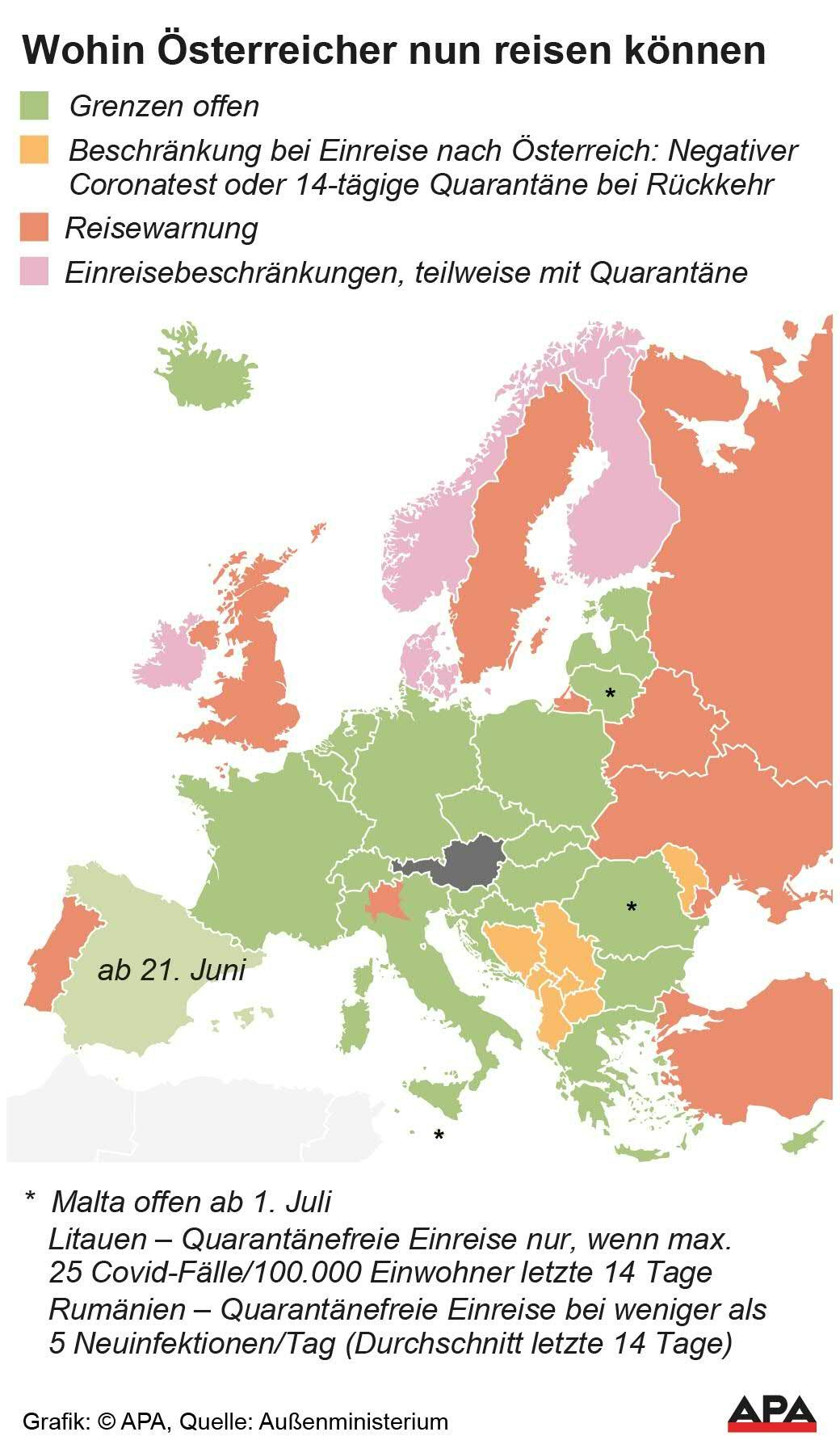 Bisher war bei der Rückkehr aus Spanien, eines der am stärksten von der Corona-Pandemie betroffenen Länder, ein Covid-Gesundheitszeugnis nach einem negativen Coronatest oder eine verpflichtende 14-tägige Heimquarantäne verpflichtend. Weiterhin gültig sind diese Maßnahmen für Schweden, Portugal und das aus der EU ausgetretene Land Großbritannien. Hier werde die Situation "laufend evaluiert", sagte Schallenberg.