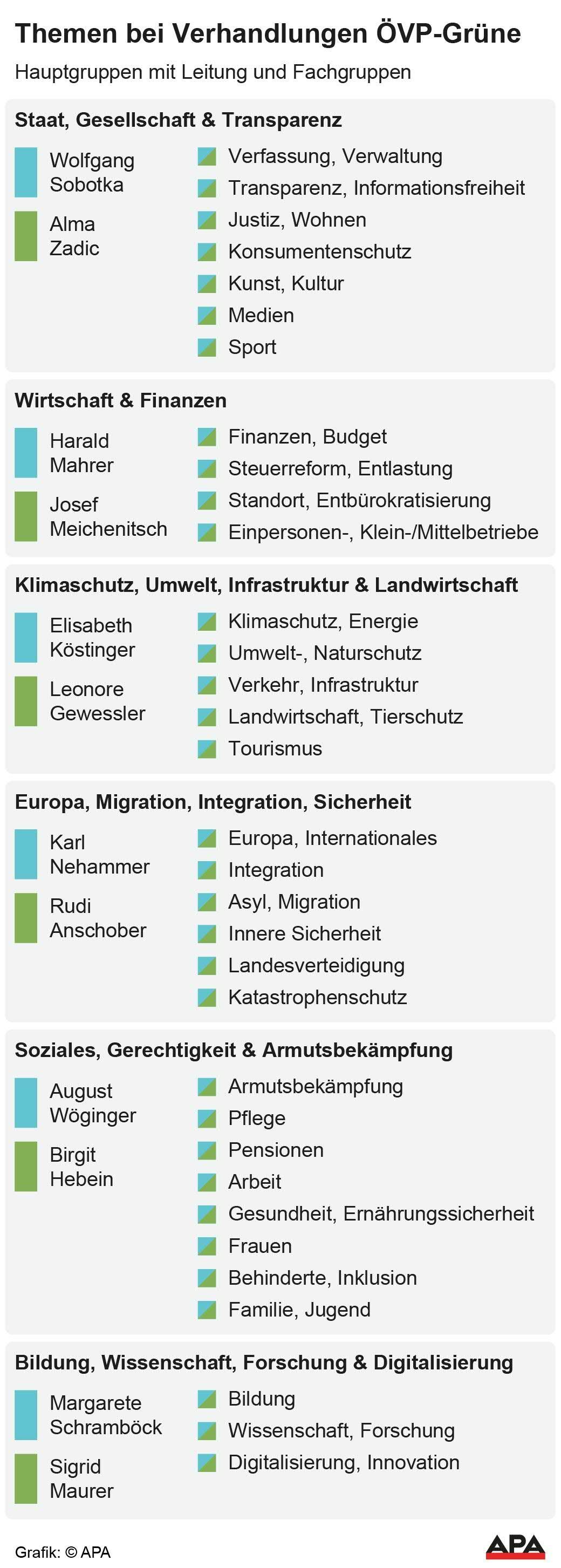 In der ersten Verhandlungsgruppe zum Thema Staat, Gesellschaft und Transparenz unter der Leitung von Alma Zadic (Grüne) und Wolfgang Sobotka (ÖVP) verhandeln auf ÖVP-Seite etwa Ex-Minister Josef Moser, Landesparteichef Gernot Blümel und Opernball-Organisatorin Maria Großbauer. Mit grünen Positionen dagegenhalten werden unter anderem der Wiener Klubchef David Ellensohn, das grüne Urgestein Walter Geyer und die Ex-Rektorin und Neo-Abgeordnete Eva Blimlinger. Das große Thema Staat, Gesellschaft und Transparenz wird aufgeteilt in mehrere Fachgruppen, die lauten: Verfassung und Verwaltung, Transparenz und Informationsfreiheit, Justiz und Wohnen, Konsumentenschutz, Kunst und Kultur, Medien und Sport.