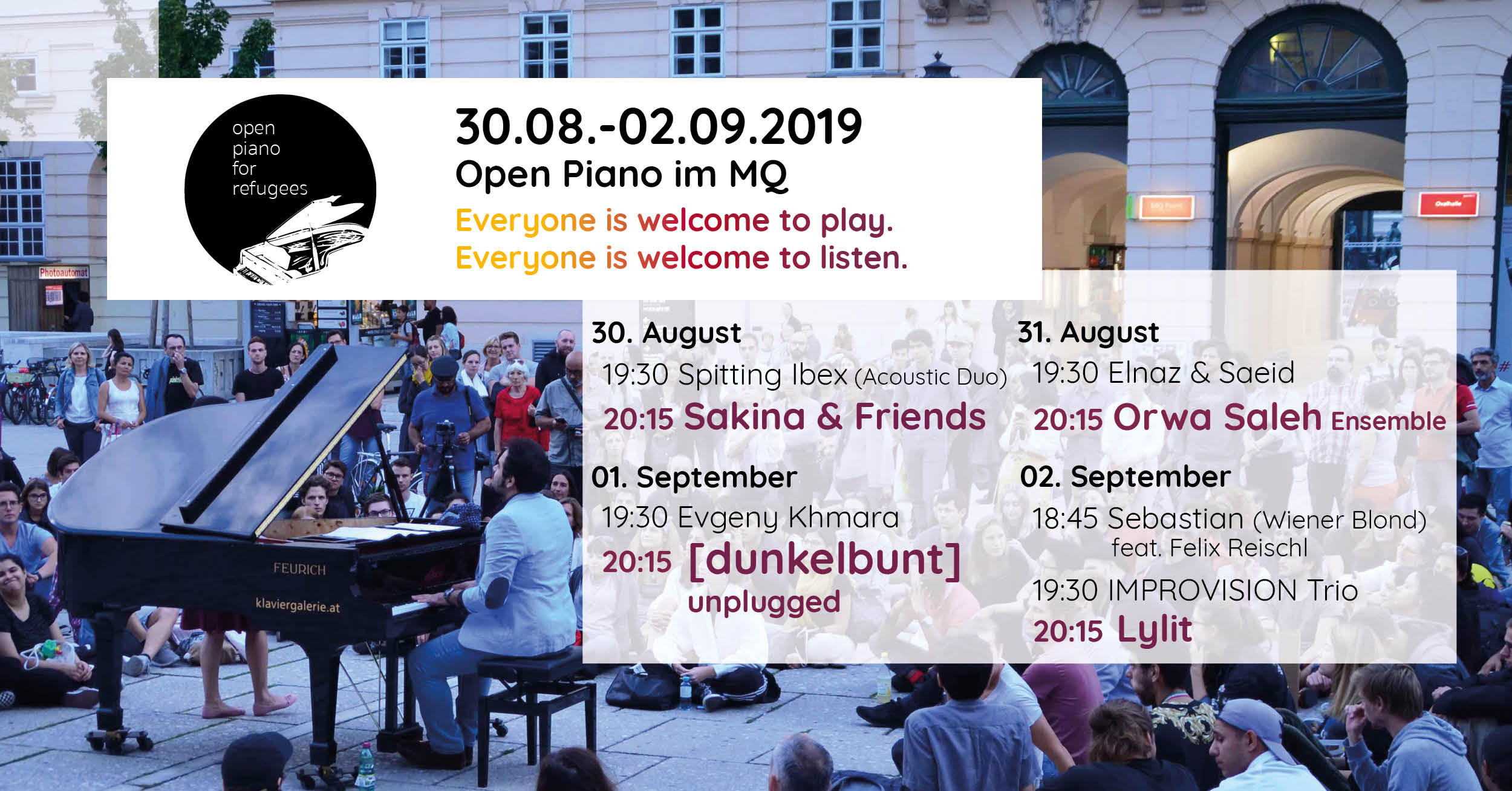 Das Sozialprojekt Open Piano for Refugees platziert einen frei zugänglichen Flügel von 30.08 - 02.09 im Museumsquartier in Wien und öffnen den Flügel bei schönem Wetter von jeweils 12:00-22:00 Uhr. Dabei gilt: Alle dürfen spielen. Alle dürfen zuhören. Bei Schlechtwetter findet das gesamte Event in der Ovalhalle indoor im MQ statt.