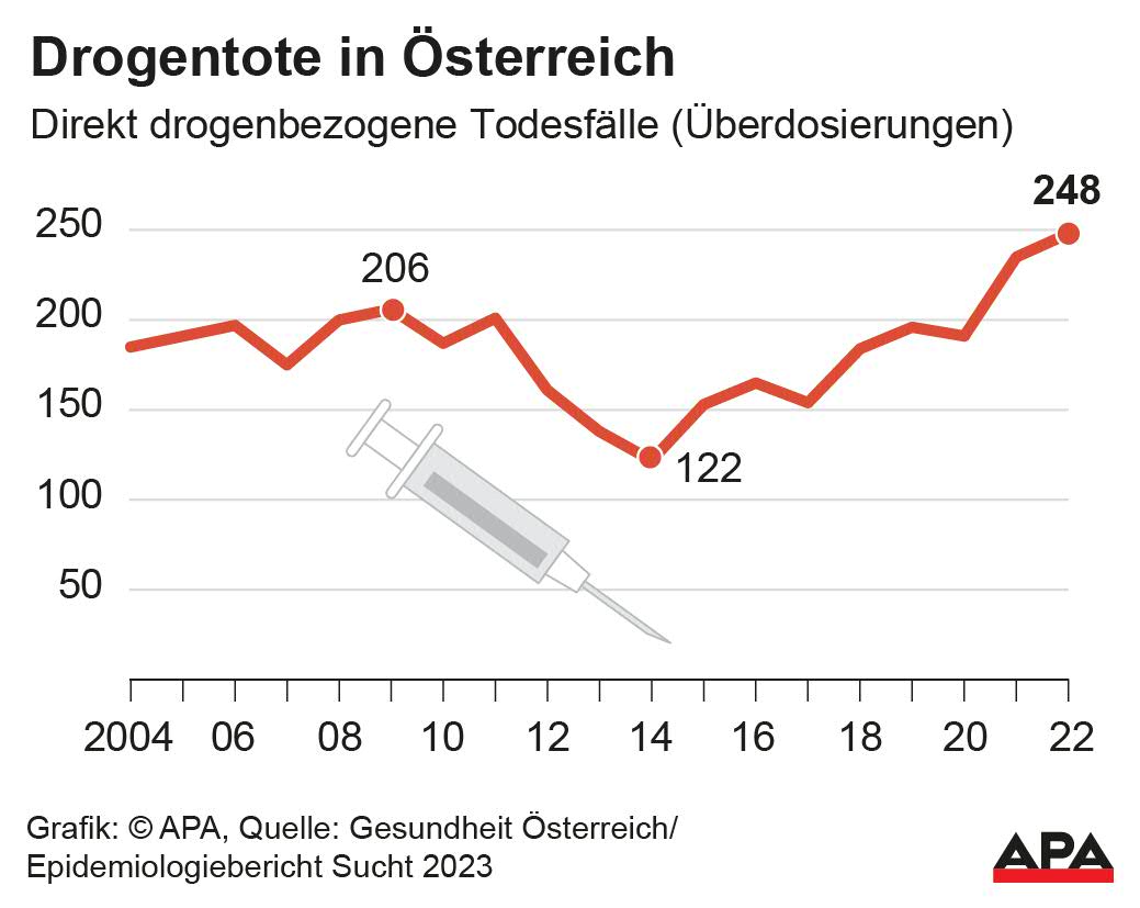 Allerdings werden tödliche Überdosierungen wieder häufiger. Im Jahr 2022 gab es 248 "drogenbezogene Todesfälle". 2014 starben "nur" 122 Menschen an den direkten Folgen des Drogenkonsums, seither steigen die Zahlen. Vor 2014 war ein Rückgang zu verzeichnen, 2009 waren es mit 206 noch deutlich mehr Todesfälle als fünf Jahre später. "Ebenso gestiegen ist der Anteil der jüngeren Verstorbenen unter 25 Jahren an allen Überdosierungen", sagte Busch: "Und zwar von 18 Prozent im Jahr 2018 auf aktuell 27 Prozent." Mögliche Ursachen sind Nachwirkungen der Pandemie, die suchtkranke Menschen besonders getroffen hätte, oder dass die Reinheit der Substanzen steigt, was das Risiko für Überdosierungen erhöht.