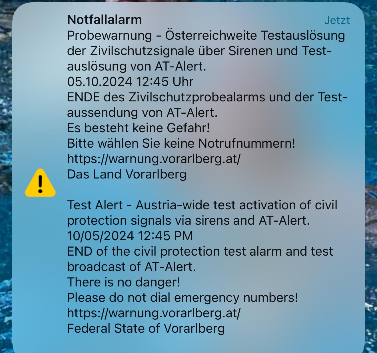 Wenn Sie um 12.45 Uhr am Samstag diese Warnung auf ihrem Handy gesehen haben, dann hat der "AT-Alert" funktioniert. Darüber hinaus war der Warnton kaum zu überhören.