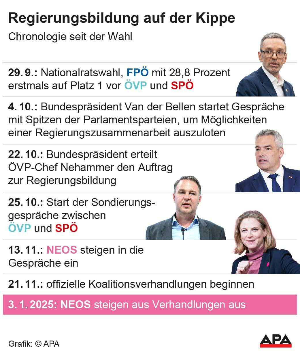 ÖVP, SPÖ und NEOS hatten seit Mitte November über die Bildung einer gemeinsamen Dreierkoalition verhandelt. Knackpunkt war dabei von Anfang an das Thema Budget und Steuern - verschärft durch den großen Konsolidierungsbedarf.