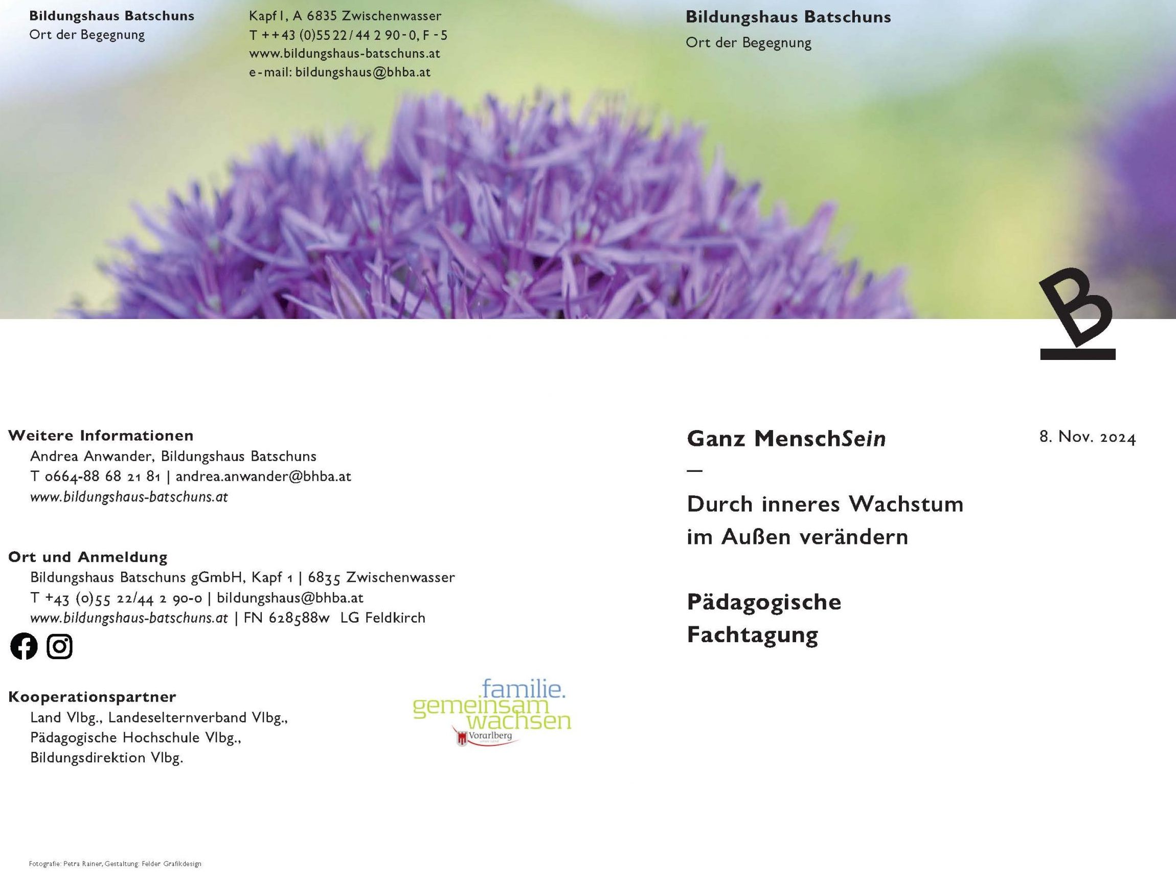 Die Tagung richtet sich an Eltern, Pädagog:innen, Therapeut:innen und alle Interessierte und wird als Fortbildung für Lehrpersonen anerkannt wird. Die Anmeldung richten Sie bitte direkt an das Bildungshaus Batschuns: bildungshaus@bhba.at