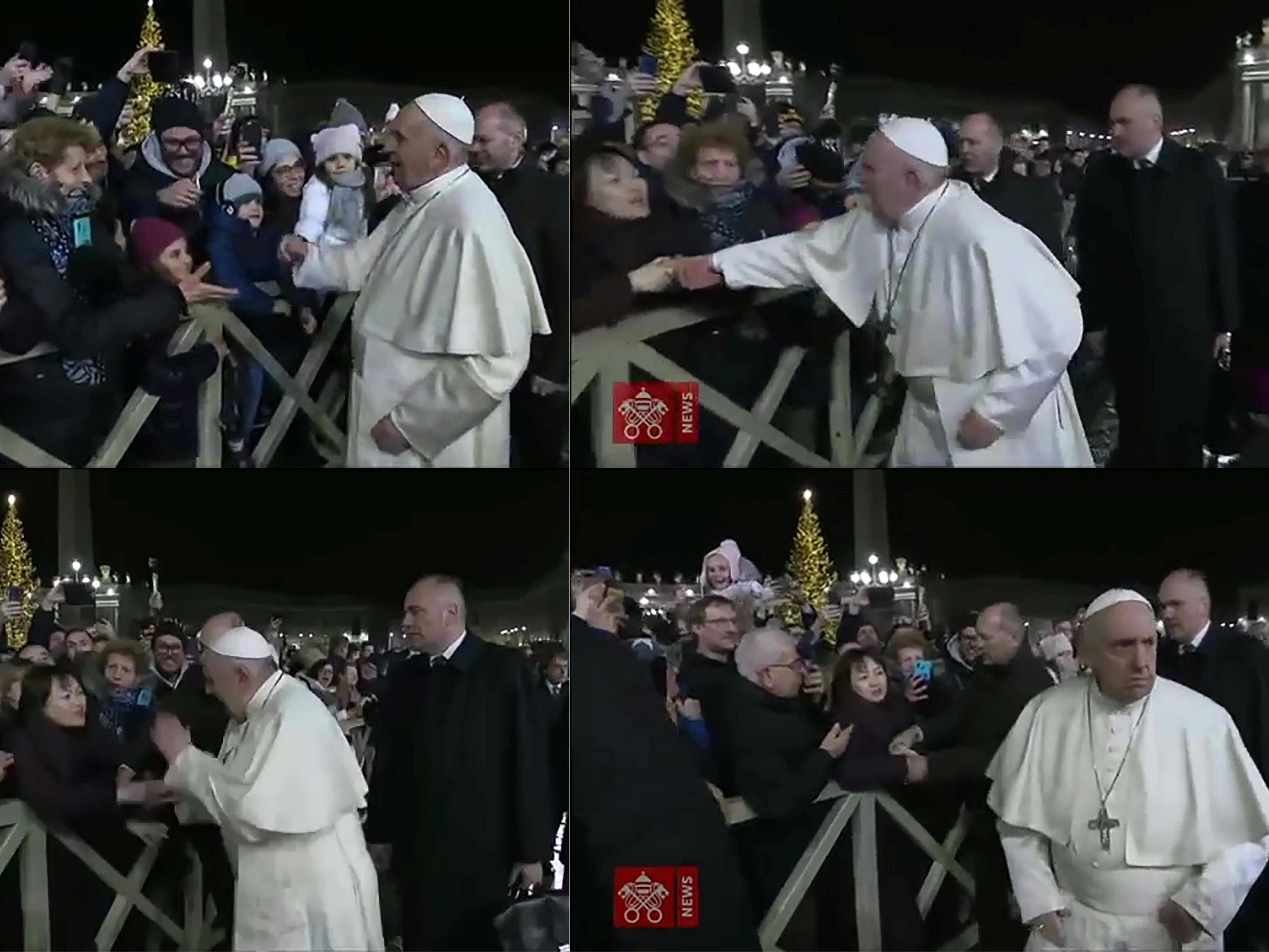 Der Papst wird fast jeden Tag von Gläubigen umringt und angefasst - jetzt wurde es Franziskus zu viel: Eine Frau wollte seine Hand nicht loslassen, als der 83-Jährige am Silvesterabend am Petersplatz in Rom unter vielen Gläubigen die Weihnachtskrippe besuchte. Auf einem Video ist zu sehen, wie die Frau ihn zu sich reißt - und Franziskus sichtlich erbost ihrer Hand einen Klaps gibt. Im Netz sorgte das auch für böse Kommentare.