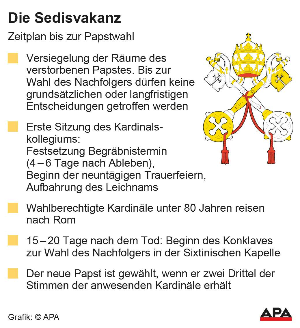 Mit dem Tod von Papst Franziskus beginnt im Vatikan eine lange Reihe von Terminen, die zum Konklave zur Wahl des neuen Papstes führen werden. Am Montagabend wurde der Leichnam des Papstes in die Kapelle des Gästehauses Santa Marta überführt, um den Ritus der Todesfeststellung und der Aufbahrung im Sarg durchzuführen.