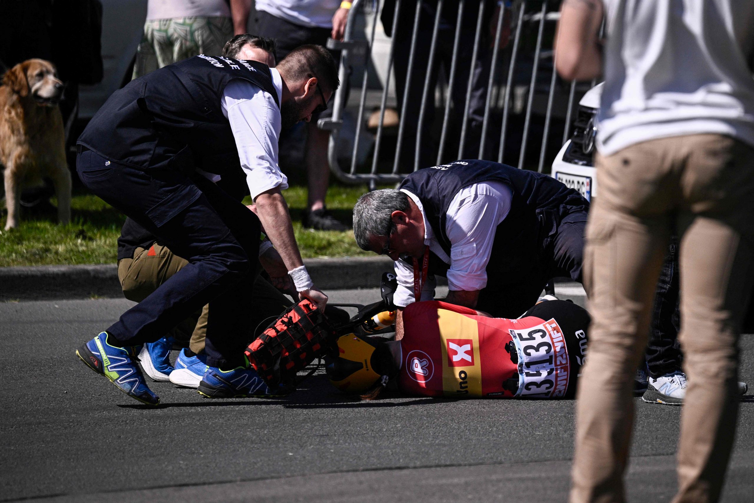 Tadej Pogačar stürzte beim Pavé-Sektor Pont-Thibault à Ennevelin rund 37 Kilometer vor dem Ziel. Laut eigener Aussage hatte er die Kurve falsch eingeschätzt, da er sich auf vorausfahrende Motorräder konzentrierte. Trotz schnellem Wiederaufsitzen und anschließendem Radwechsel verlor er den Anschluss an Mathieu van der Poel und erreichte das Ziel mit 1:18 Minuten Rückstand.