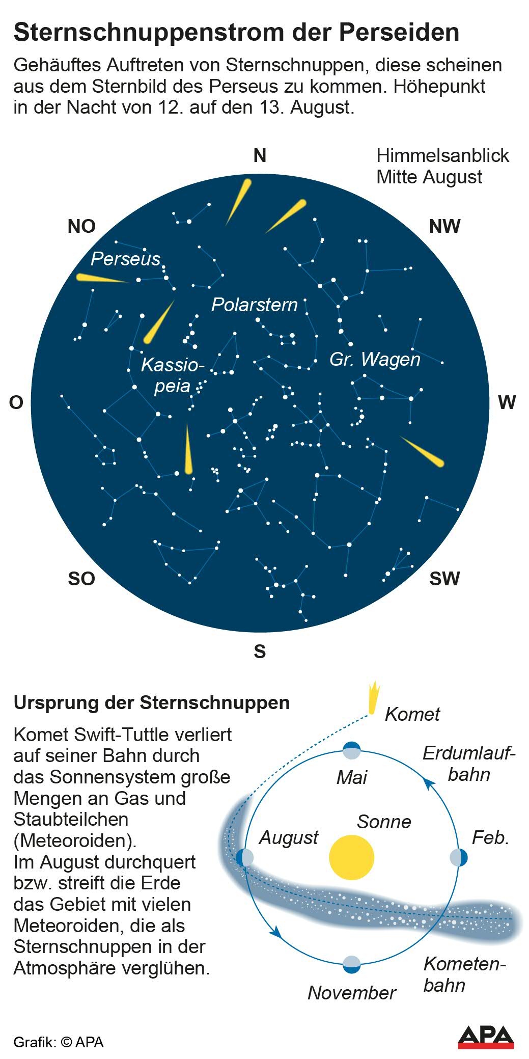 Die Perseiden haben einen gemeinsamen Ursprung, den Komet 109 P/Swift-Tuttle. Die Erde kreuzt ihn auf ihrer Bahn um die Sonne und trifft dabei auf die von ihm verstreuten Teile. "Jede einzelne Sternschnuppe ist in Wirklichkeit ein Staubteilchen, das in dem Falle mit relativ großen Geschwindigkeiten auf die Erde trifft", erläuterte Carolin Liefke, stellvertretende Leiterin des Hauses der Astronomie in Heidelberg. "Wir reden über so was wie 30, 35 Kilometer pro Sekunde."