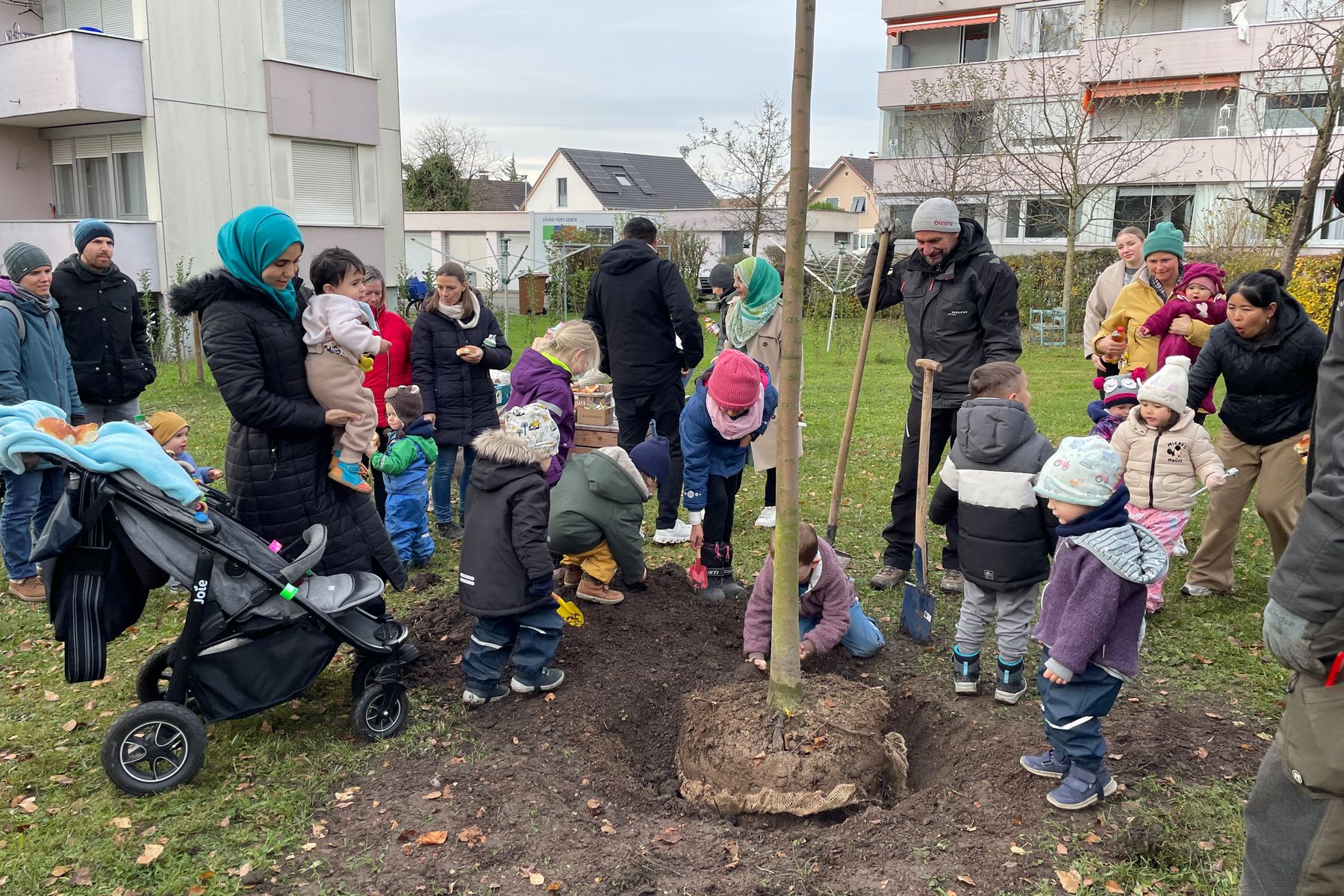 Beim Spielplatz Sandgasse wurden diese Woche zwei neue Bäume – ein Apfelbaum und eine Kastanie – im Rahmen der Aktion #jedemkindeinbaum gepflanzt. Die Mitarbeitenden der Stadtgärtnerei wurden dabei von 21 Familien mit rund 30 Kindern unterstützt.