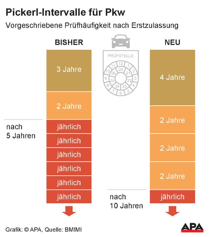 Künftig soll ein neues Modell mit dem Intervall 4-2-2-2-1 gelten: Für Neuwagen bedeutet das eine erste Pickerl-Kontrolle erst nach vier Jahren, dann folgen drei zweijährige Intervalle, und erst ab dem zehnten Jahr muss das Fahrzeug jährlich zur Überprüfung.