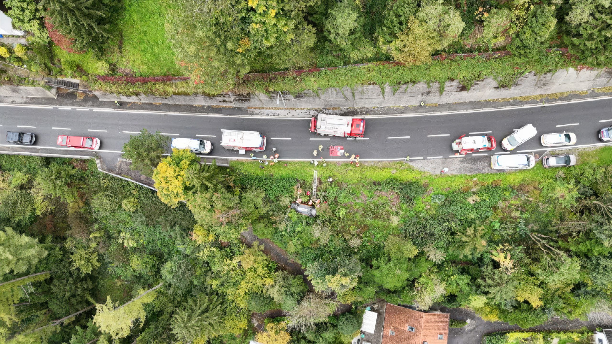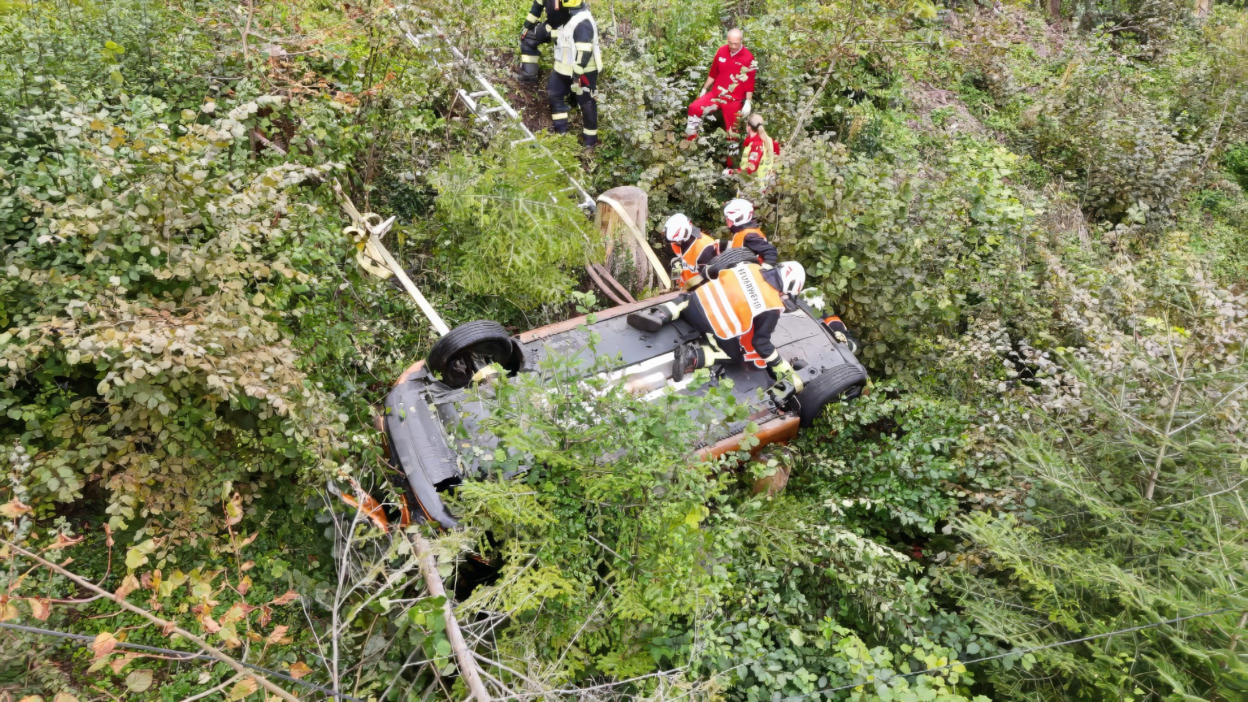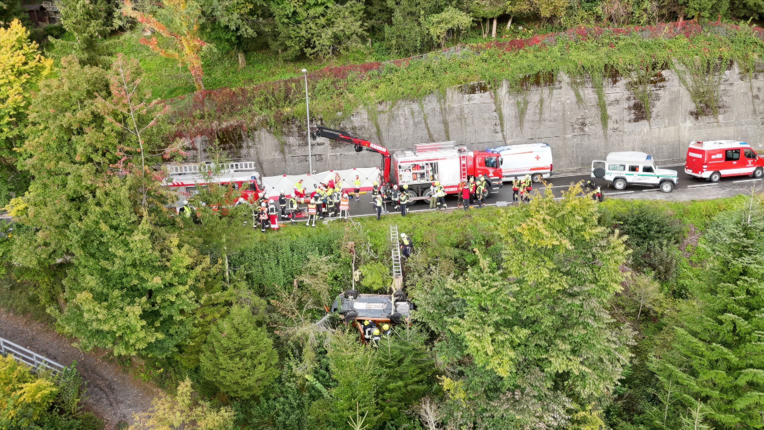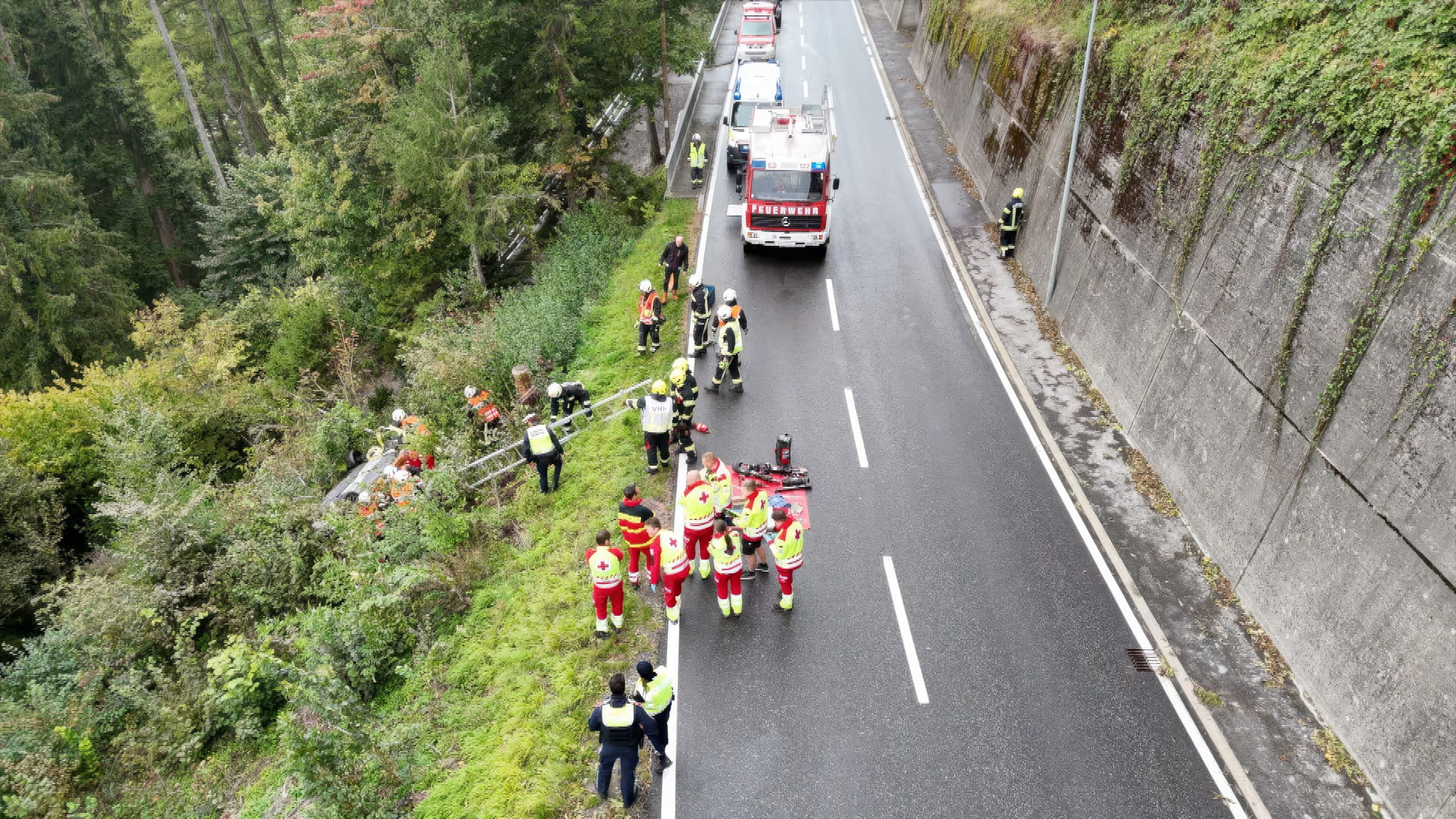 Ein in Richtung Bregenz fahrender Pkw kam am Sonntag (5. Oktober 2025) gegen 15.30 Uhr von der Fahrbahn ab, überschlug sich einmal und stürzte rund 20 Meter einen steilen Hang hinab. Das Fahrzeug blieb zwischen Baumstümpfen auf dem Dach liegen.
