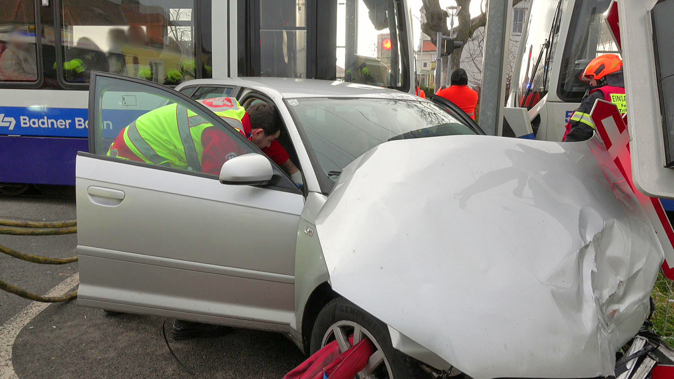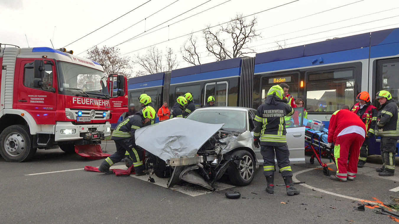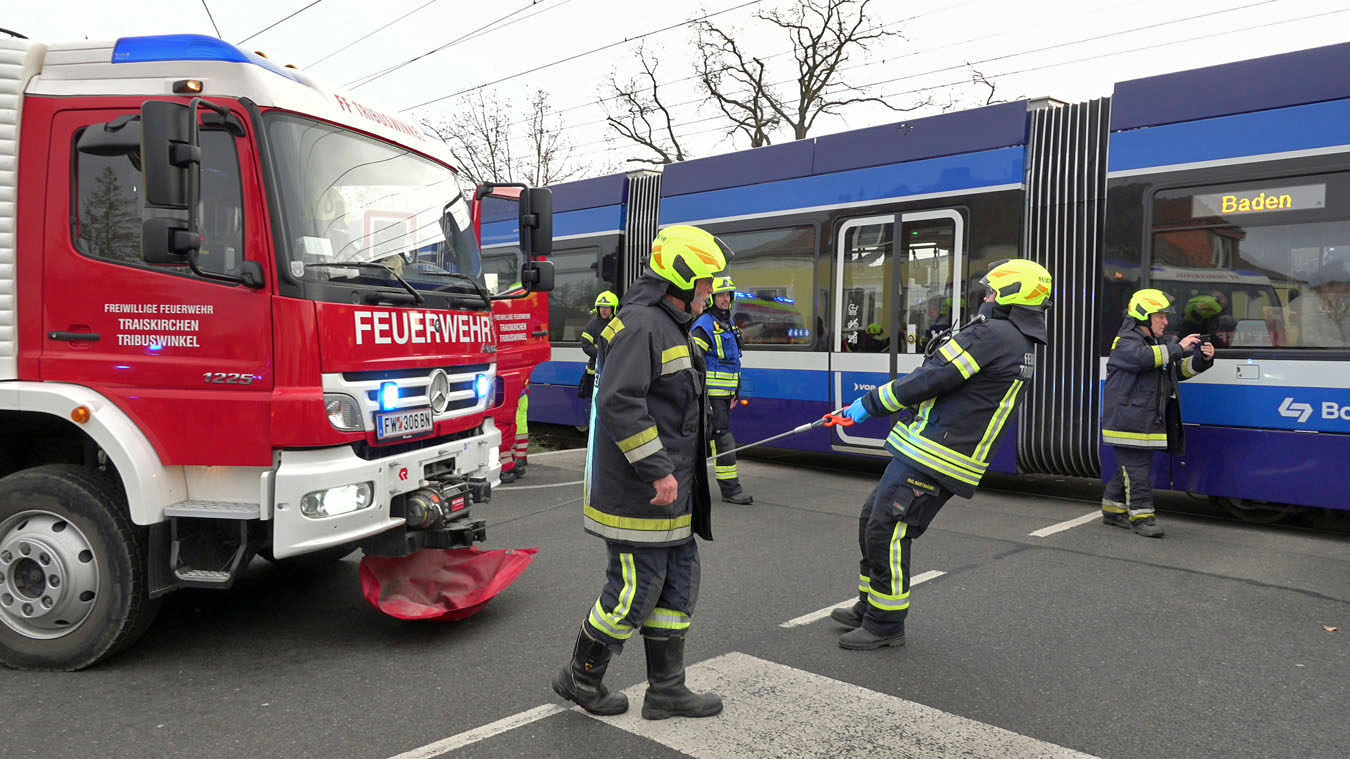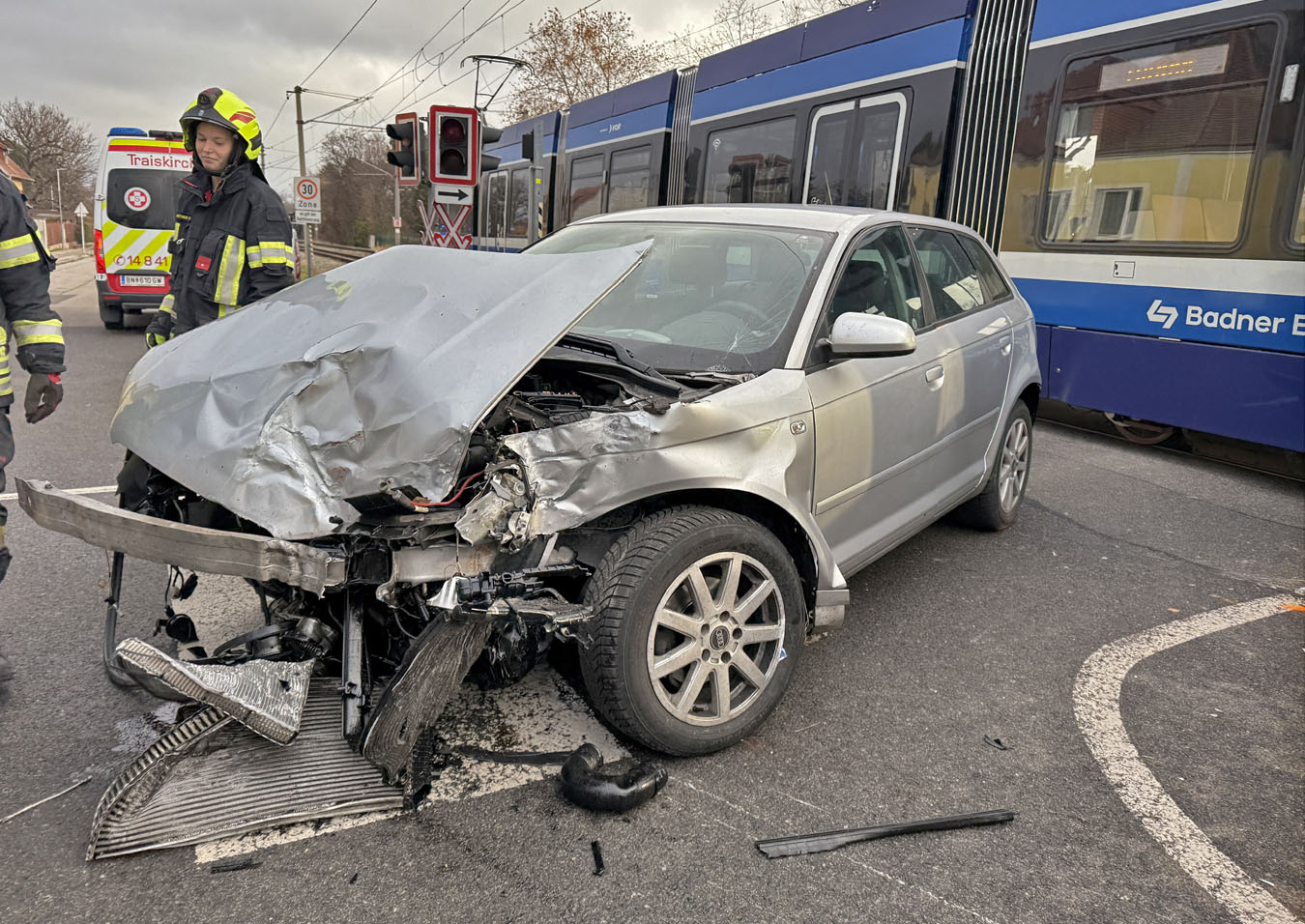Ein Auto mit zwei Insassen kollidierte mit einem in Richtung Baden fahrenden Zug der Badner Bahn. Dabei wurde das Fahrzeug frontal erfasst und gegen eine Ampel geschleudert. Passanten riefen den Notruf 122 und meldeten den Unfall an die Feuerwehr. Als die Freiwilligen Feuerwehren Tribuswinkel und Pfaffstätten ausrückten, war unklar, ob Insassen eingeklemmt oder weitere Personen verletzt waren.