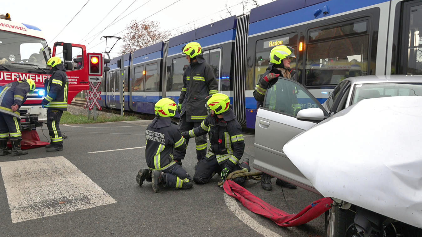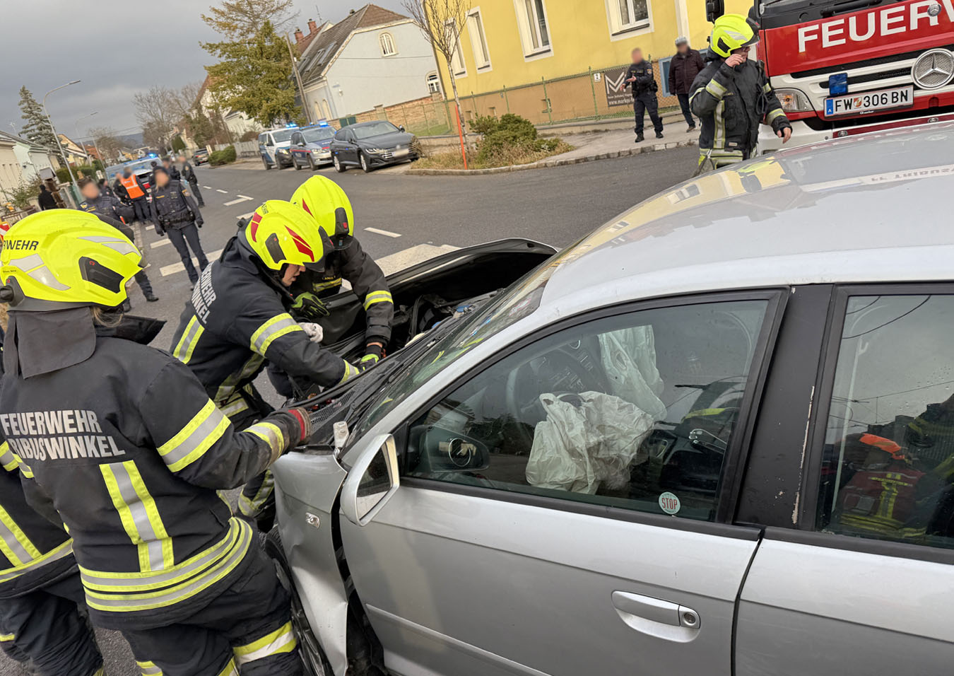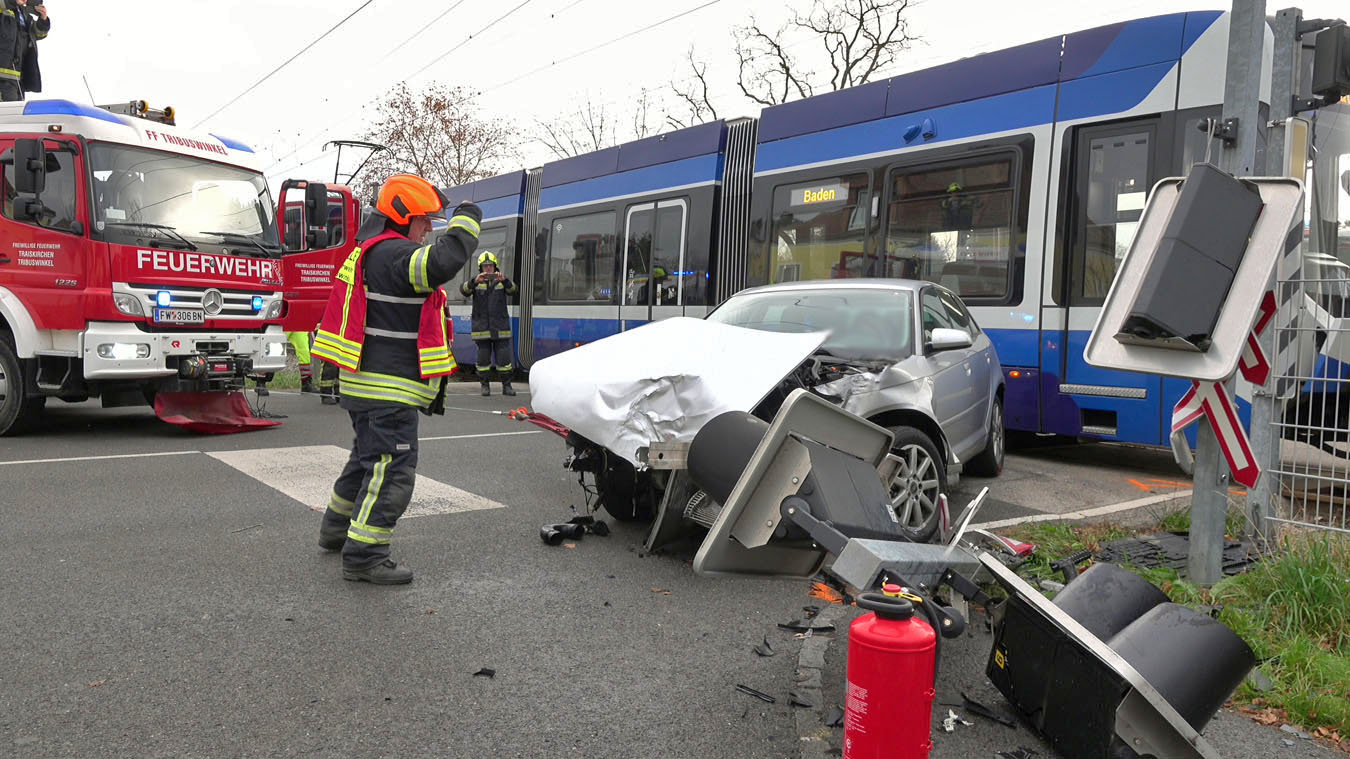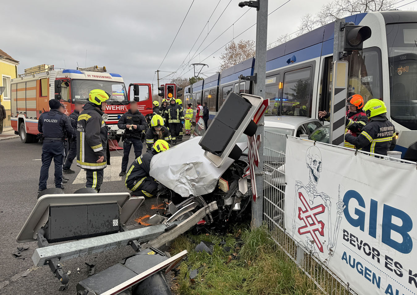 Ein Auto mit zwei Insassen kollidierte mit einem in Richtung Baden fahrenden Zug der Badner Bahn. Dabei wurde das Fahrzeug frontal erfasst und gegen eine Ampel geschleudert. Passanten riefen den Notruf 122 und meldeten den Unfall an die Feuerwehr. Als die Freiwilligen Feuerwehren Tribuswinkel und Pfaffstätten ausrückten, war unklar, ob Insassen eingeklemmt oder weitere Personen verletzt waren.