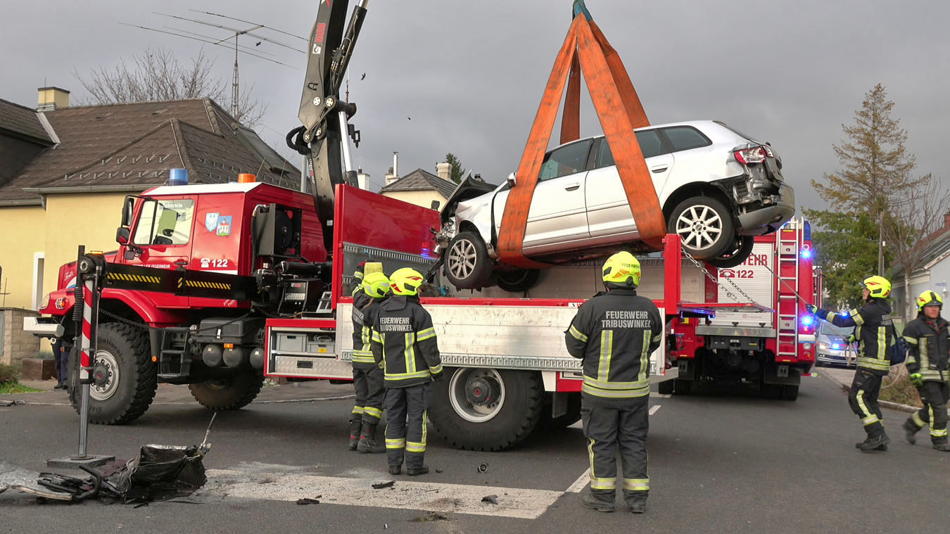 Beim Eintreffen der Einsatzkräfte stand die Badener Bahn über dem Bahnübergang und Haltestellenbereich Tribuswinkel still. Fahrgäste waren noch im Zug. Ein Pkw war zwischen dem Zug, einer umgerissenen Lichtsignalanlage und einem Signalmast eingeklemmt. Der Fahrer im Auto war bei Bewusstsein und nicht eingeklemmt, hatte jedoch Fußschmerzen. Der Beifahrer befand sich bereits im Rettungsfahrzeug. Der Pkw wurde zur schonenden Befreiung des Fahrers mit einer Seilwinde seitlich weggezogen.