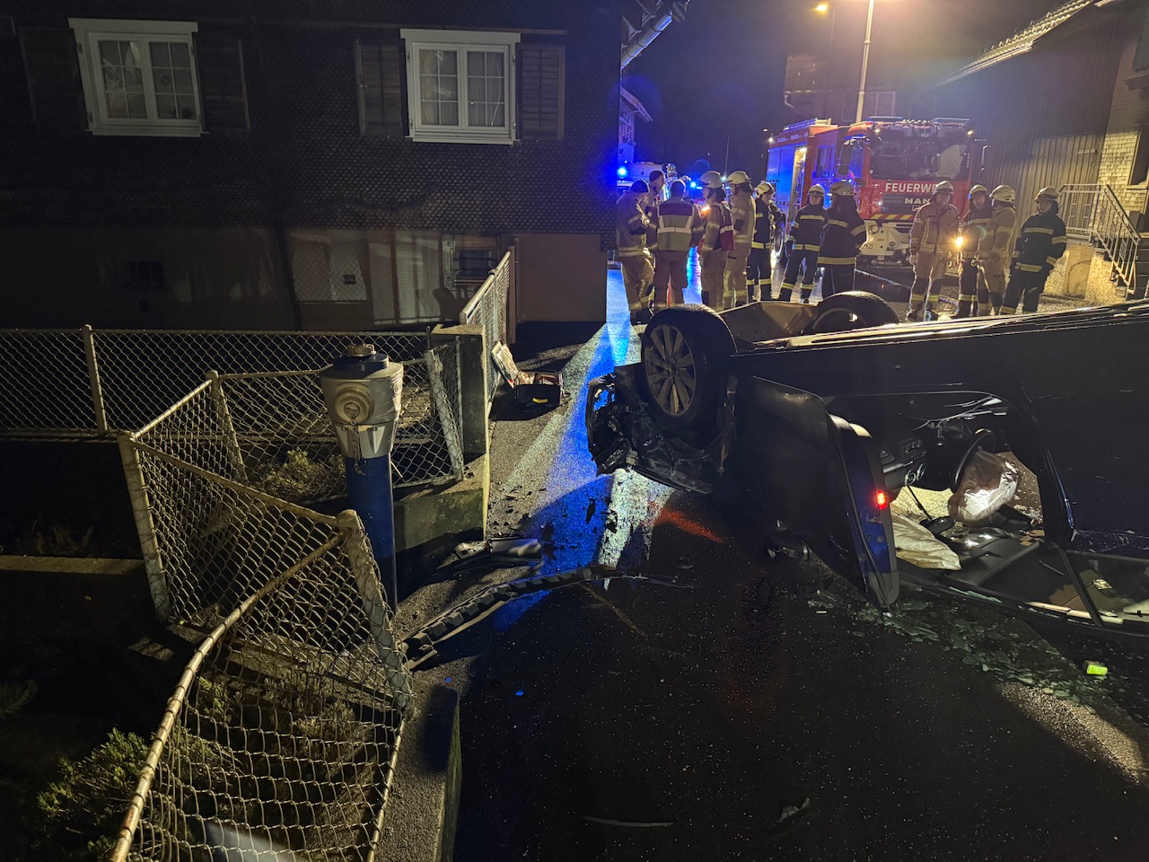 Aktuell geht die Polizei davon aus, dass das Fahrzeug von einem 53-jährigen Mann gelenkt worden war. Dieser dürfte mit der rechten Fahrzeugseite gegen eine Grundstücksmauer gefahren und folglich auf die Gegenfahrbahn geraten sein. Dort kam es zu einer neuerlichen Kollision mit einer Grundstücksmauer bzw. einem Gartenzaun, sowie einem dortigen Hydranten. Dadurch dürfte das Fahrzeug in Schräglage geraten und sich in weiterer Folge überschlagen haben. Das Fahrzeug kam auf dem Dach zum Liegen.