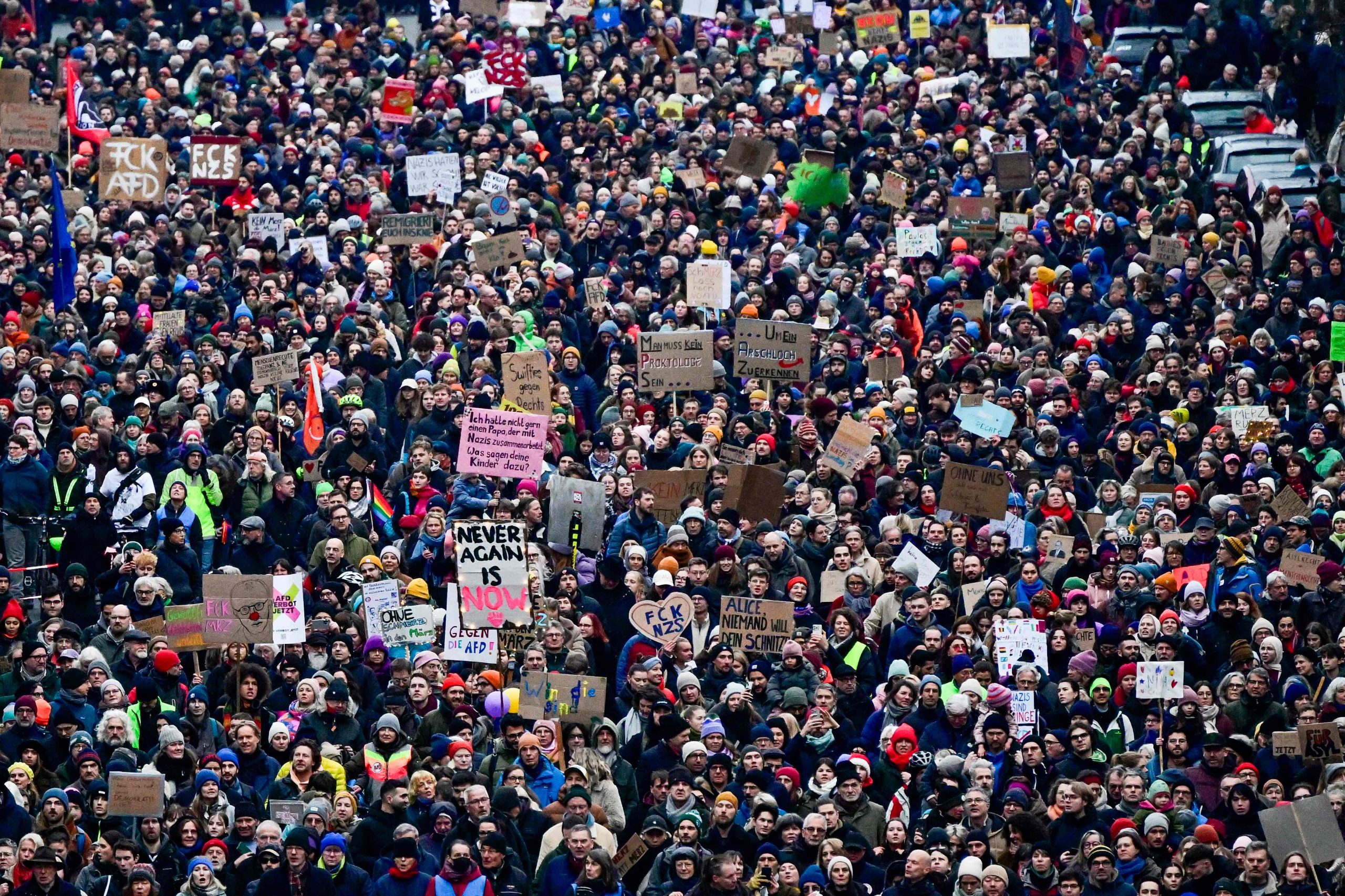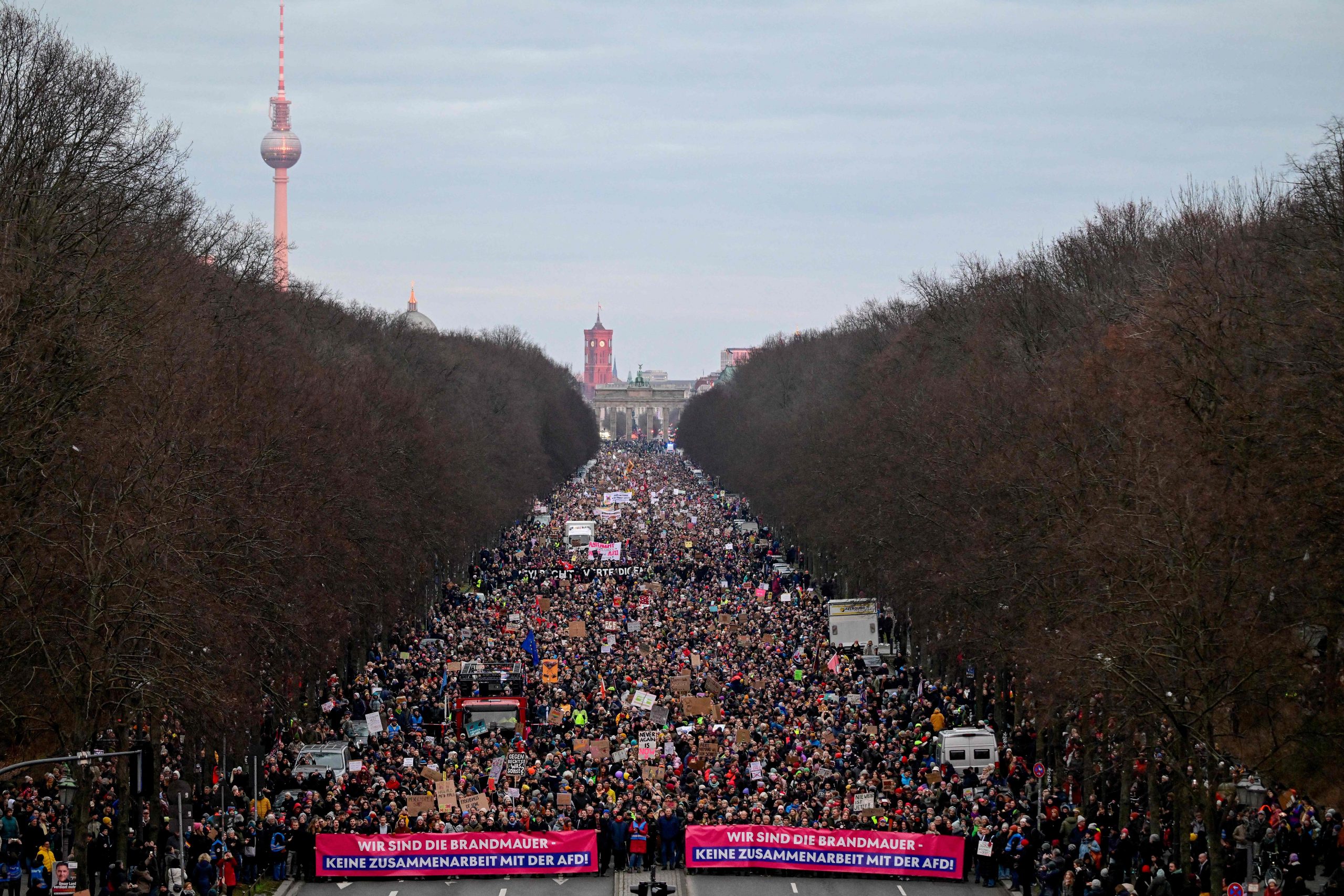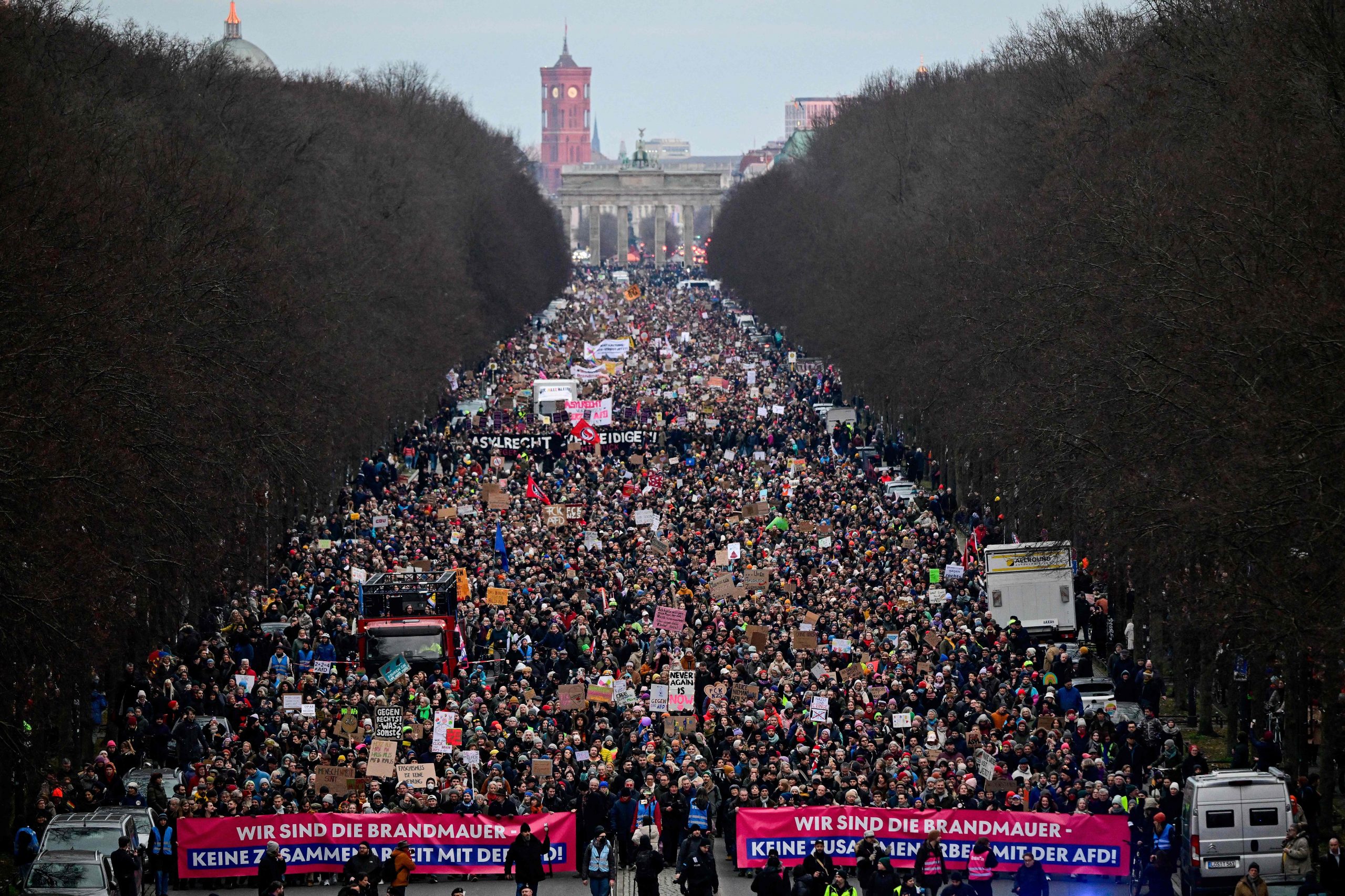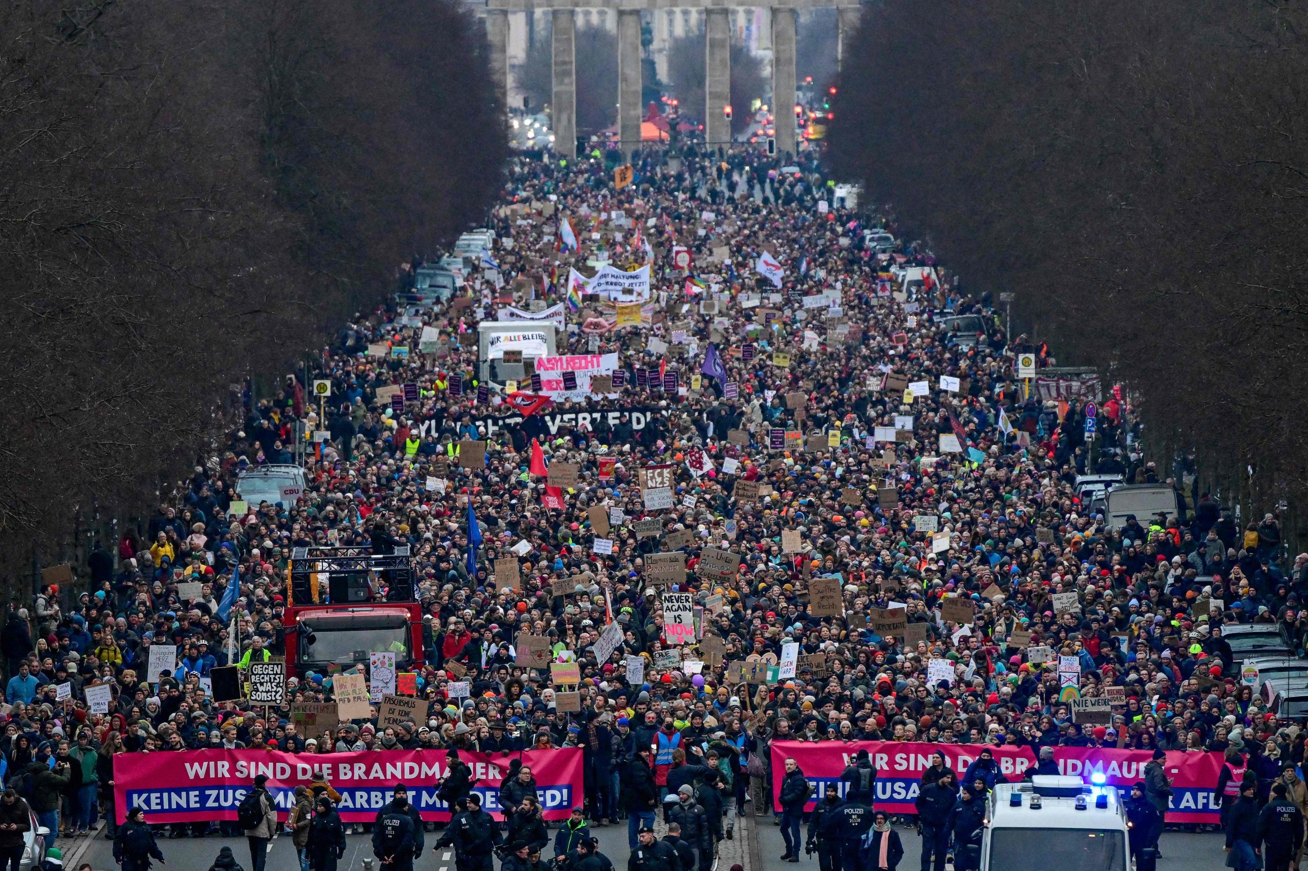 Die Demonstration steht unter dem Motto "Aufstand der Anständigen - Wir sind die Brandmauer!" Dazu aufgerufen hat das Kampagnenbündnis Campact. Der Protest richtet sich vor allem gegen die Union, deren Antrag für Zurückweisungen an deutschen Grenzen am Mittwoch im Bundestag eine Mehrheit auch mit den Stimmen der AfD erhalten hatte.