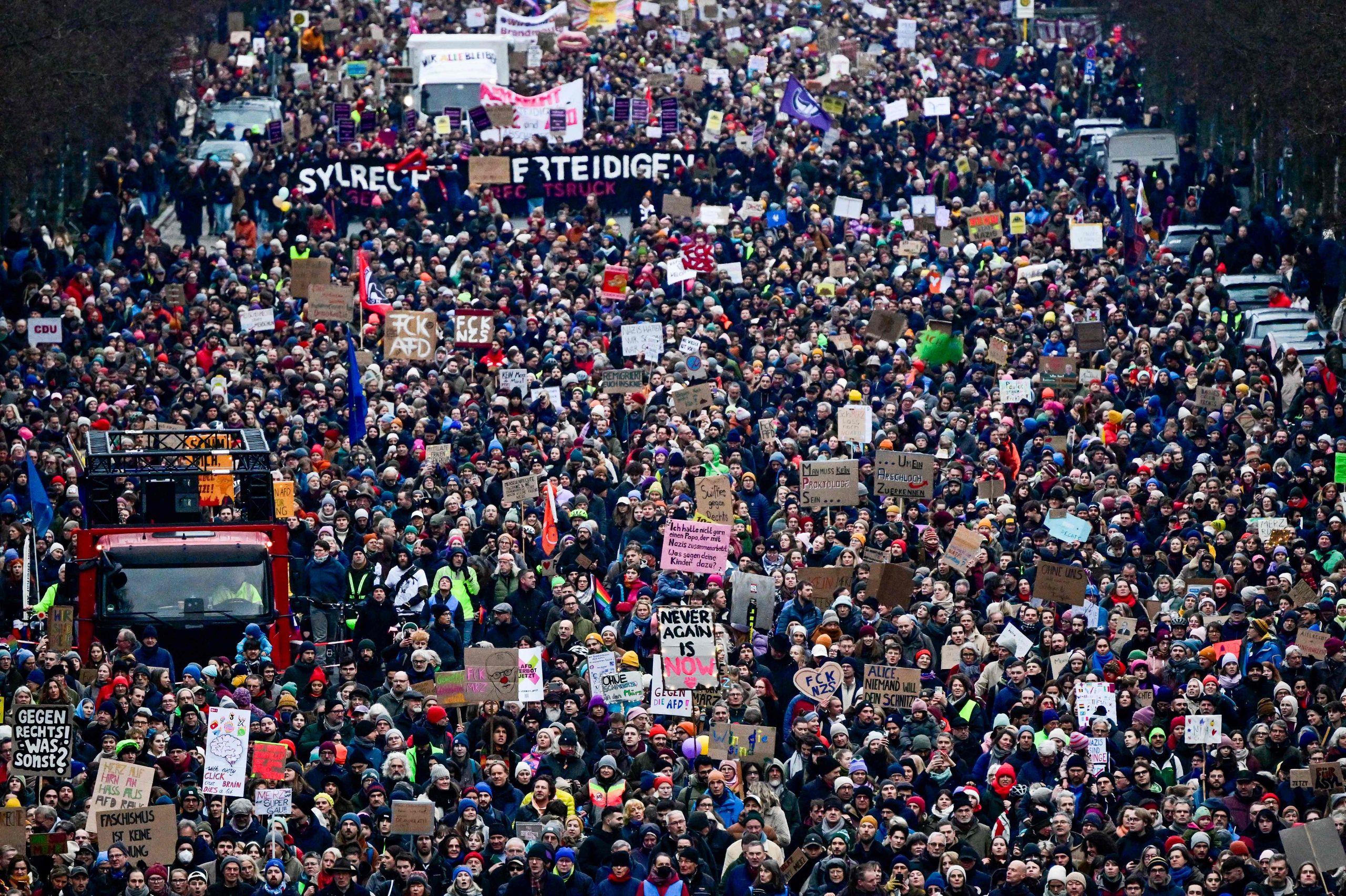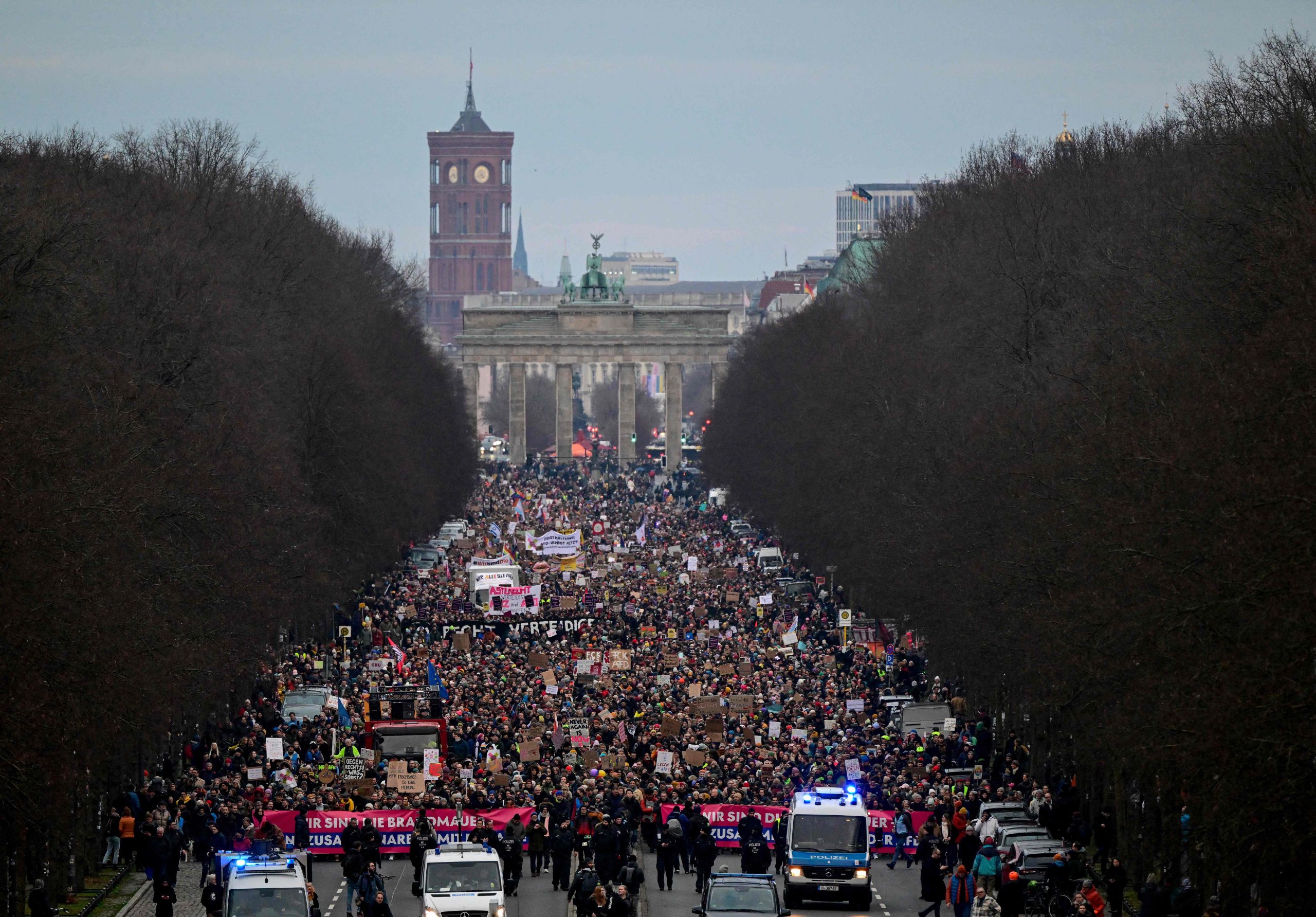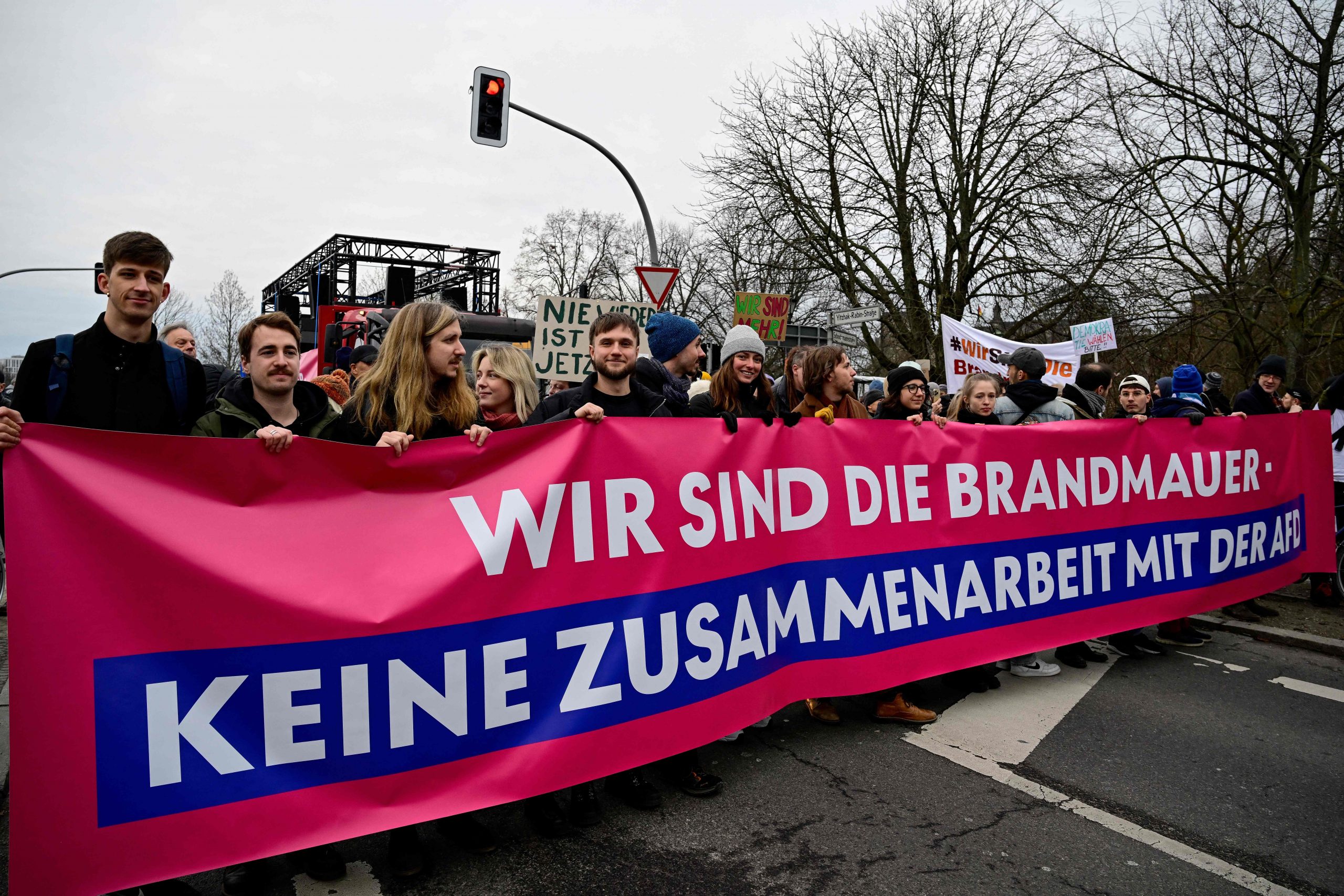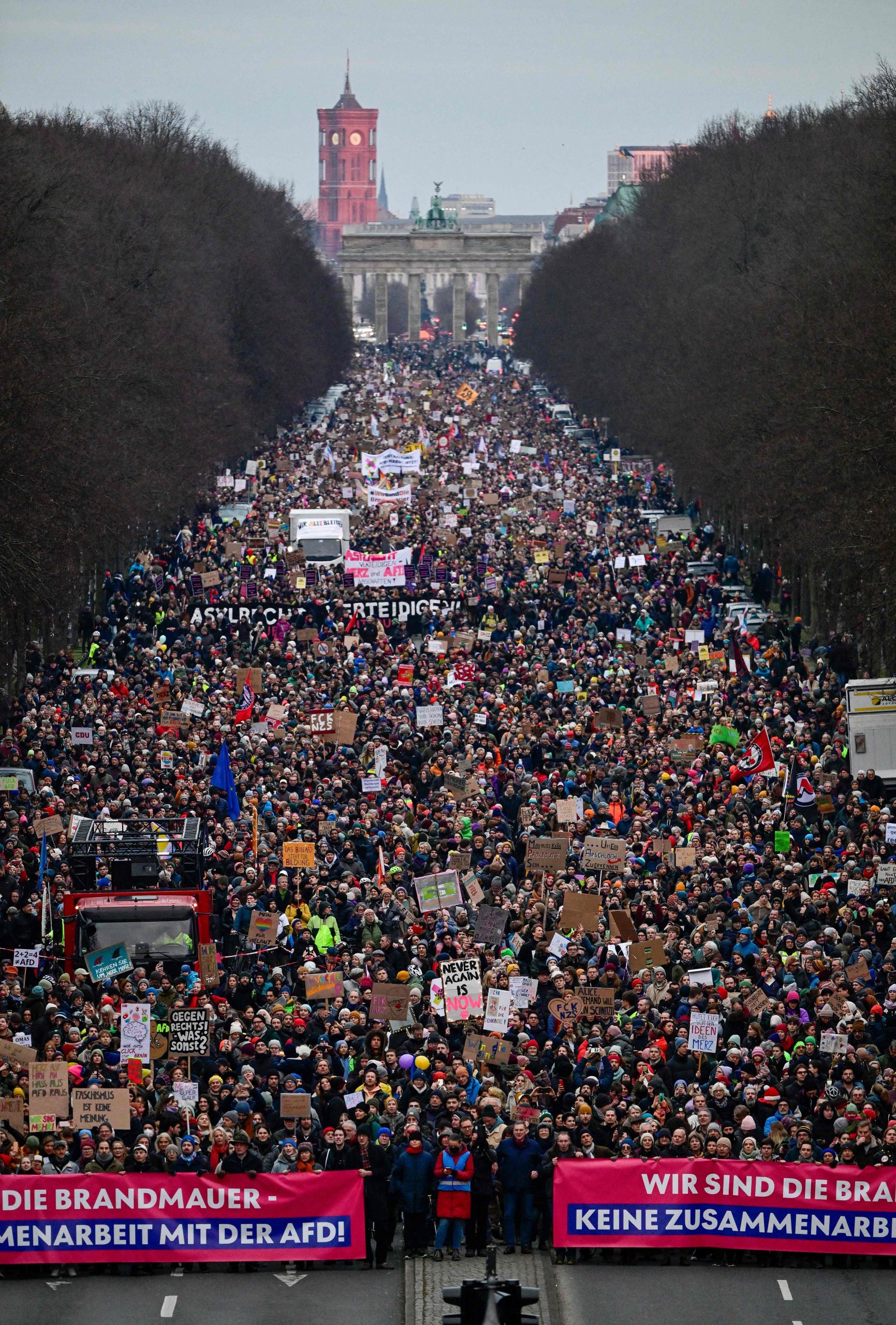 Die Demonstration steht unter dem Motto "Aufstand der Anständigen - Wir sind die Brandmauer!" Dazu aufgerufen hat das Kampagnenbündnis Campact. Der Protest richtet sich vor allem gegen die Union, deren Antrag für Zurückweisungen an deutschen Grenzen am Mittwoch im Bundestag eine Mehrheit auch mit den Stimmen der AfD erhalten hatte.