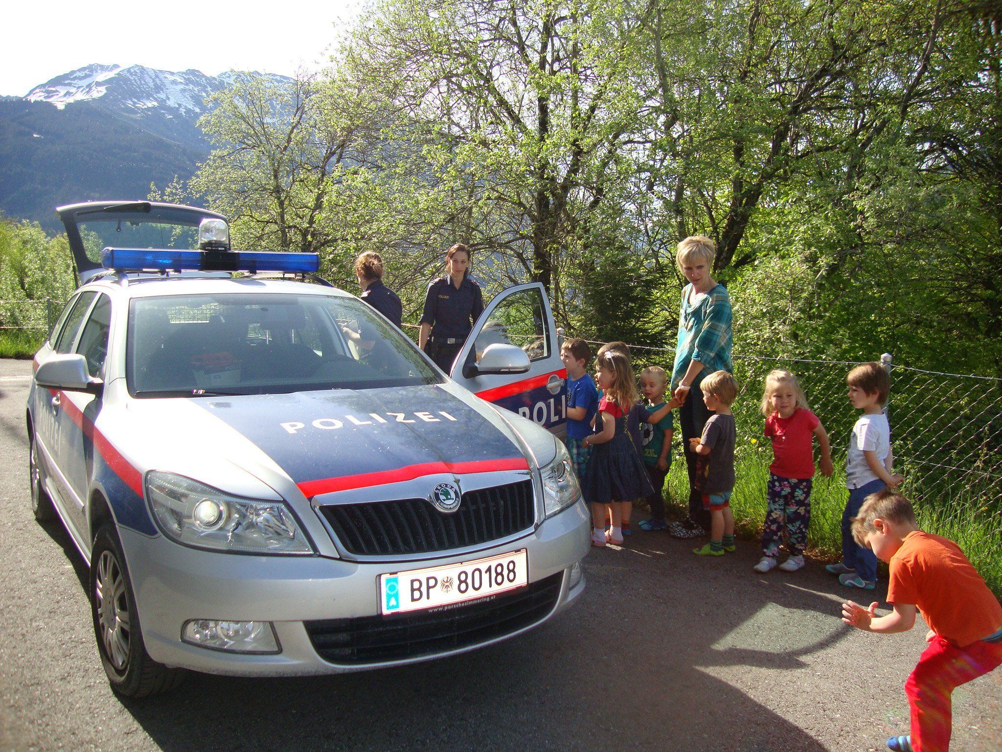 Neugierig betrachteten wir alle Dinge, die die Polizistinnen an ihrem Gürtel tragen: Pfefferspray, Handschellen, Funkgerät, Pistole,…Mindestens ebenso begeistert waren die Kinder vom Polizeiauto, das sie sowohl von innen als auch von außen genauestens unter die Lupe nehmen durften. Zum krönenden Abschluss probierten wir Mütze, die schusssichere Weste und nicht zuletzt die laute Sirene aus.