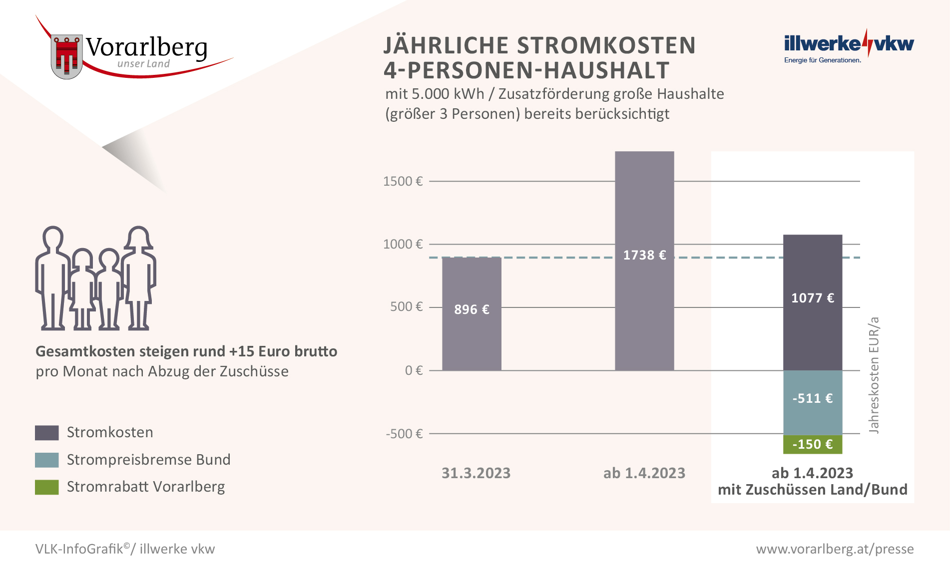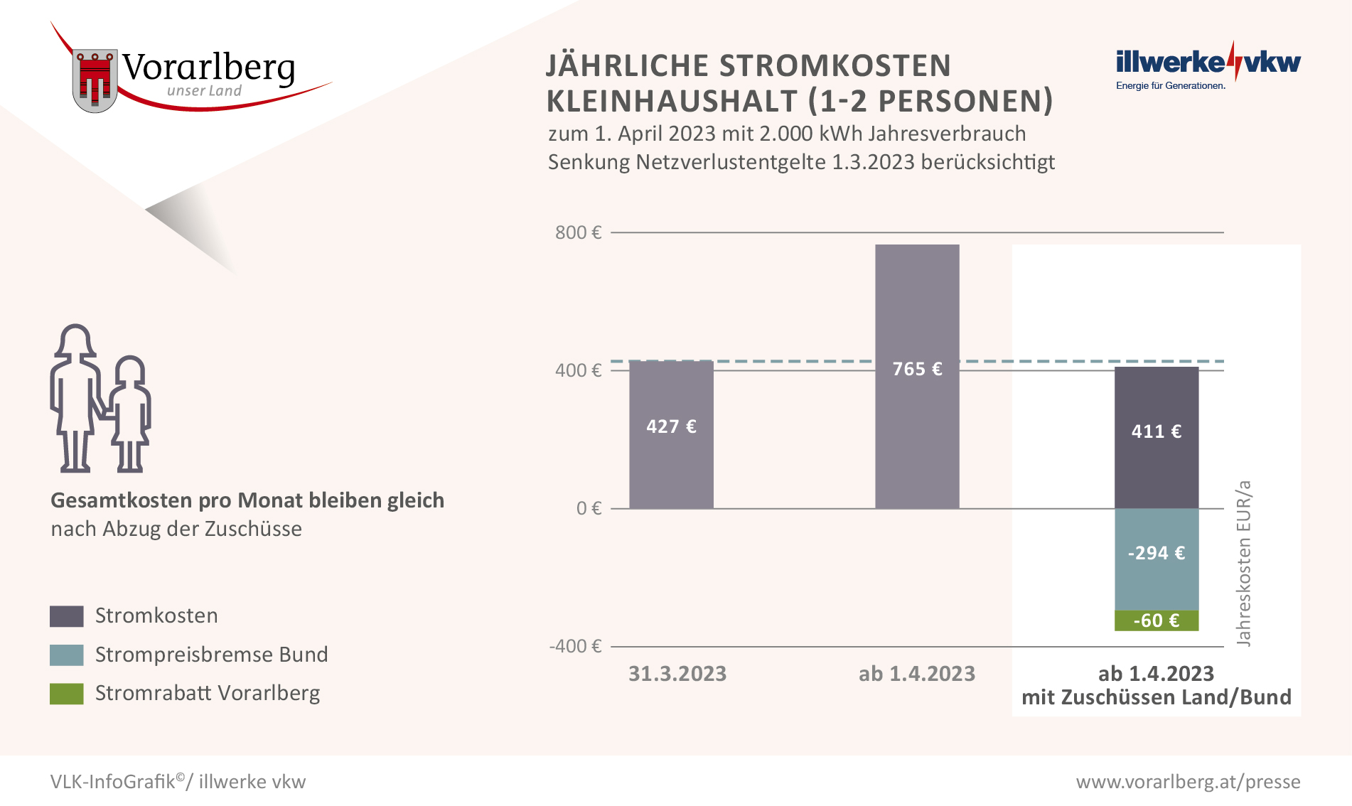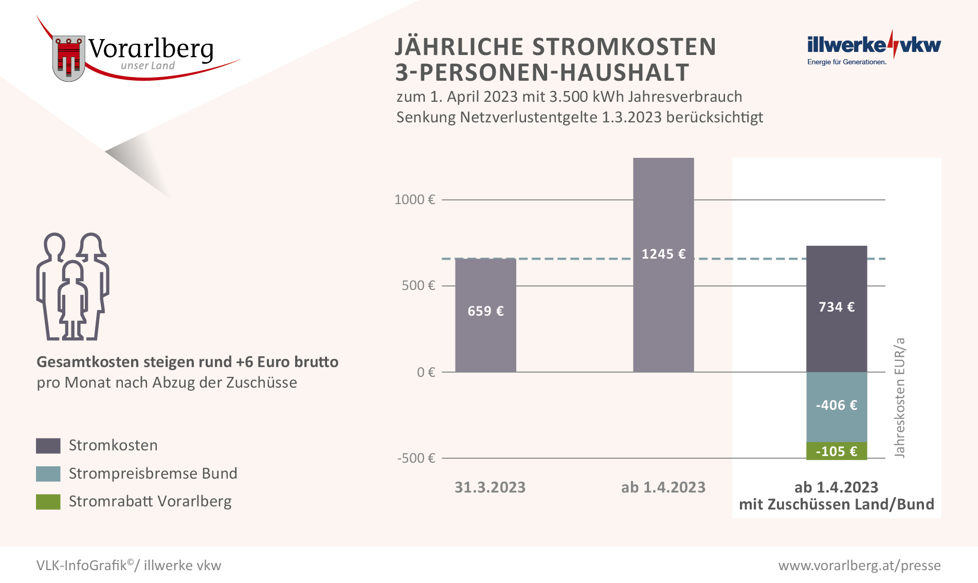 Der Stromrabatt ist so gestaltet, dass es - anders als bei der Strompreisbremse des Bundes - keine Deckelung hinsichtlich des Verbrauchs (Strompreisbremse: bis 2.900 Kilowattstunden) gibt. Ab 1. April erhalten alle Stromkunden in Vorarlberg, nicht nur jene von illwerke vkw, einen Rabatt in Höhe von 3 Cent pro Kilowattstunde. Das führt dazu, dass sich der Strompreis für Kleinhaushalte mit einem Jahresverbrauch von ca. 2.000 Kilowattstunden unter Berücksichtigung der Strompreisbremse und des Rabatts sogar verbilligt: von aktuell 427 auf 411 Euro. Etwa die Hälfte der Vorarlberger Haushalte liege bei einem Verbrauch von bis zu 2.900 Kilowattstunden, für diese wird es keine Verteuerung geben. Bei Drei-Personen-Haushalten (3.500 Kilowattstunden) wird sich die Stromrechnung von 659 auf 734 Euro (um 6 Euro pro Monat) erhöhen. Bei Vier-Personen-Haushalten (5.000 Kilowattstunden) betragen die Mehrkosten 15 Euro pro Monat (von 896 auf 1.077 Euro).