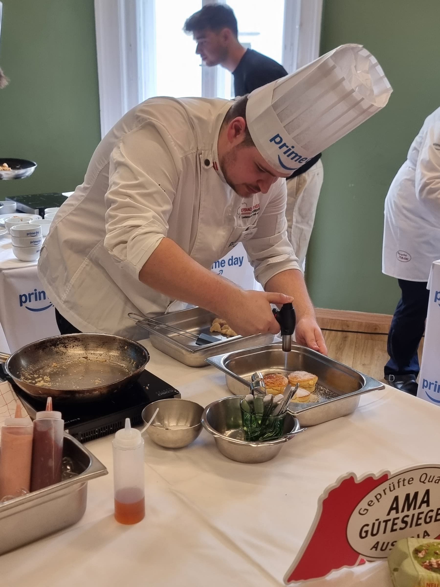 Andreas Török von der Landesberufsschule Lochau belegte den dritten Platz. Sein Gericht "Kaiserschmarren Smash & Plum Magic" kombinierte vier Zwetschgen-Komponenten – fermentiert, als Gel, Espuma und Eis – mit Crumble und Törtchen.
