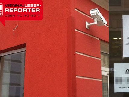 Simon G., der uns die Bilder der leicht paranoiden Installation zukommen ließ, sieht einen möglichen Zusammenhang mit einem Schild, das nahe den Überwachungskameras im Fenster hängt. Darauf gibt man zu verstehen, dass unverbesserliche Schwarz-Plakatierer lieber gleich das Weite suchen sollten. Vielleicht will man mit den Kameras auch hartnäckigen Graffiti-Sprayern auf die Schliche kommen, wie sie in Neubau ja bekanntlich öfter ihr Unwesen treiben?