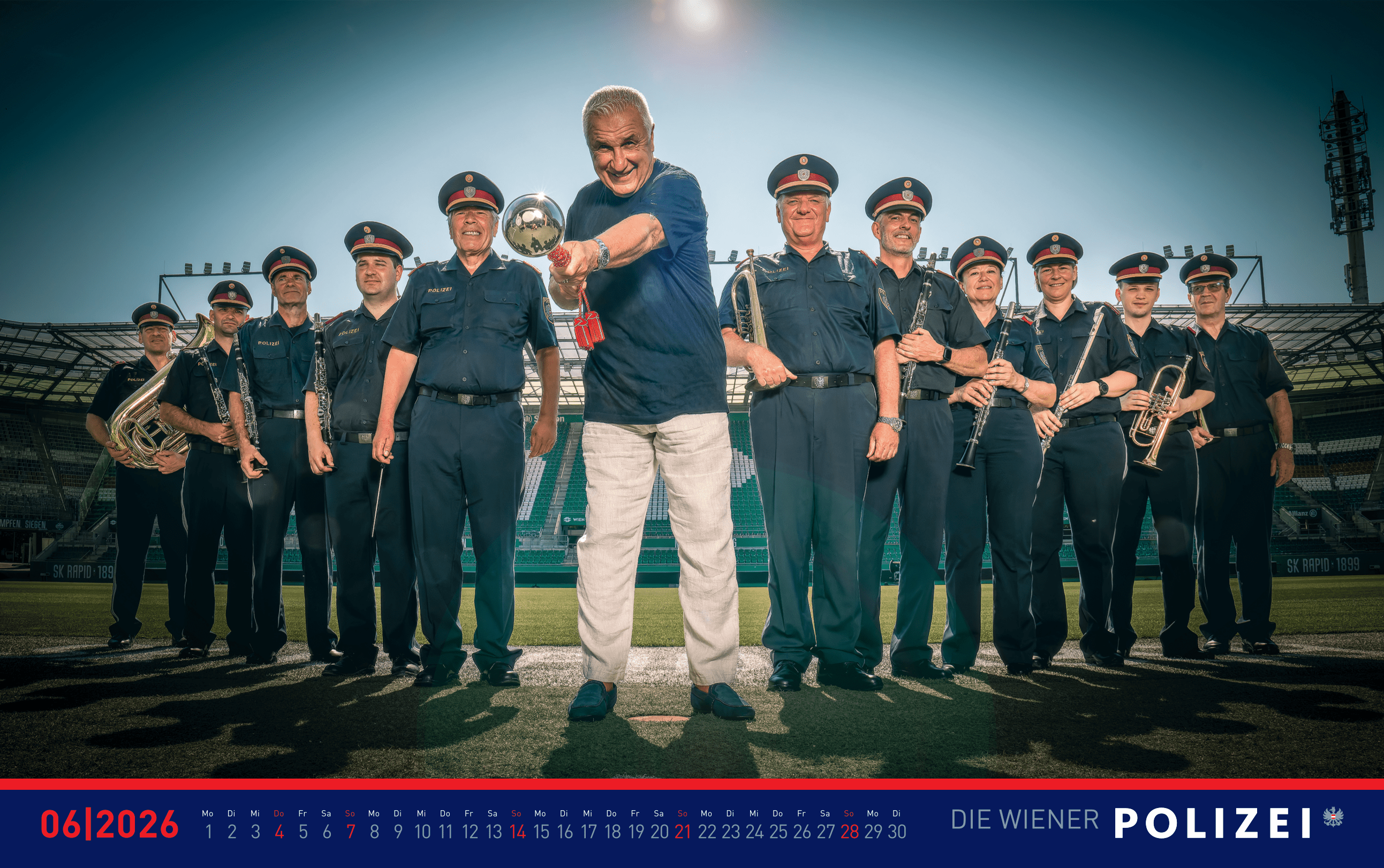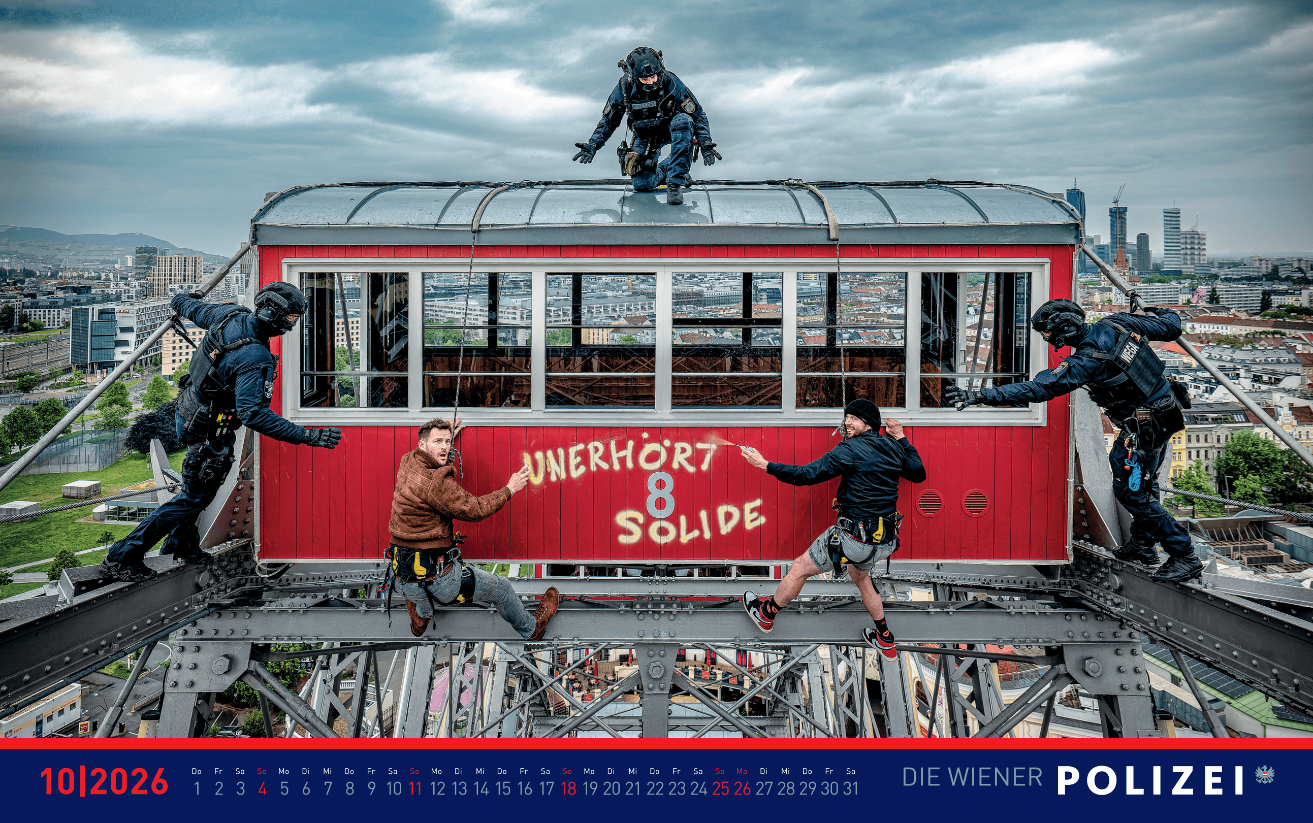 Das Thema des Wiener Polizeikalenders für 2026 lautet: "Prominenz und Polizei". Prominente aus Sport, Kunst und Kultur ließen sich mit Wiener Polizistinnen und Polizisten, die täglich für die Sicherheit der Stadt sorgen, an verschiedenen Orten ablichten. Die entstandenen Kalenderfotos zeigen die vielfältigen Aspekte des Polizeiberufs mit einem humorvollen Augenzwinkern.