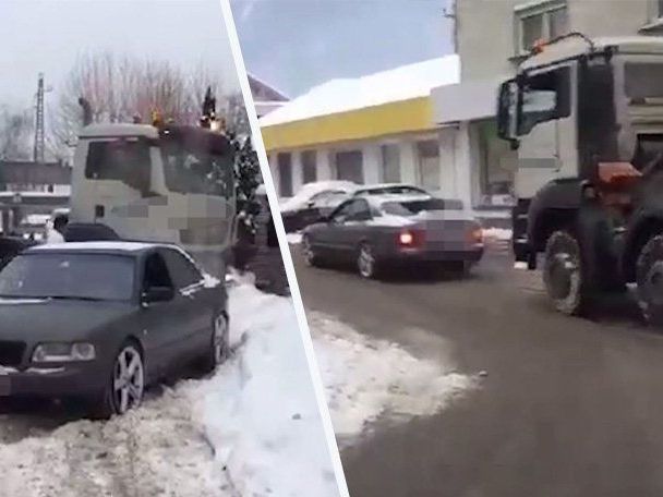 Am Mittwoch spielte sich in Bludenz eine kuriose Szene ab, die wir sonst eigentlich nur aus Werbe-Videos kennen: Ein Lkw wird von einem Audi abgeschleppt. Doch dieses Video ist kein Fake. Nachdem der Lkw-Fahrer sein Ladegut bei der Baustelle abgeladen hatte und weiterfahren wollte, steckte der Laster in der verschneiten Straße fest. Schnell war ein Retter gefunden. Ein rund 400 PS starker Audi S8 half dem bewegungsunfähigen Fahrzeug aus seiner prekären Lagen und zog diesen auf die bereits frei geräumte Straße.