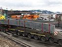 Am Montag wurde mit der Montage und den Vorbereitungsarbeiten begonnen. Heute wurden die Trogelemente für die Fahrbahn mit Hilfe eines 200-Tonnen-Krans in die Stützen eingehoben. Dafür wurden mittels Schwertransportern bis zu 45 Tonnen schwere Betonelemente der Firma Nägele aus Röthis hergefahren.