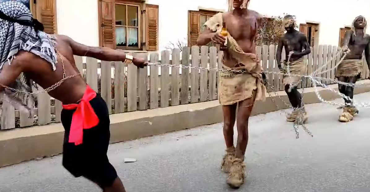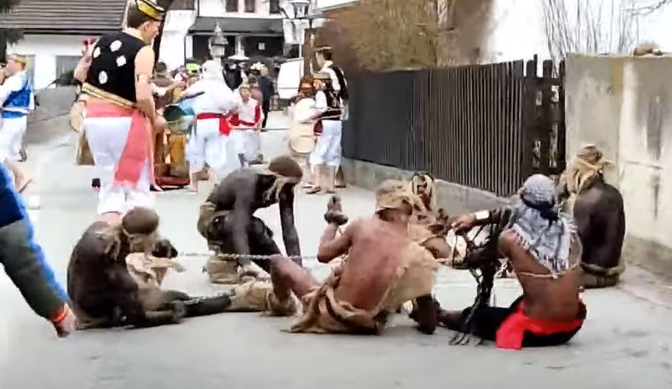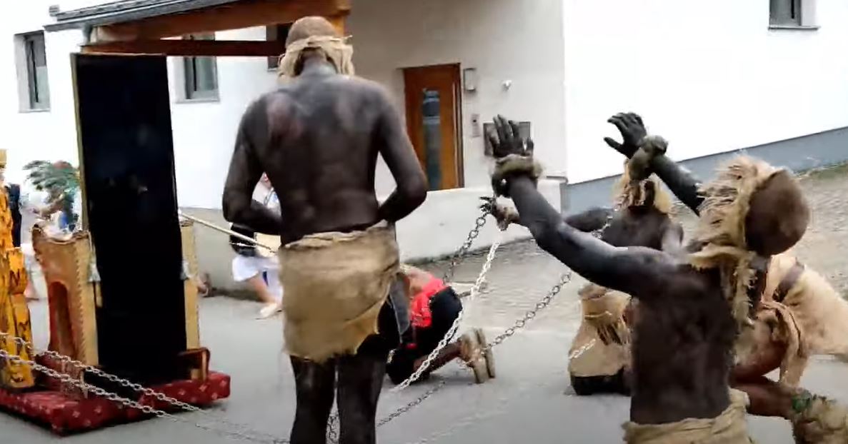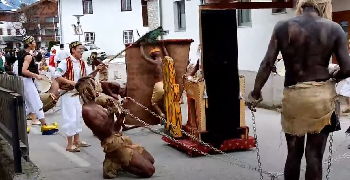 Die Männer sind bis auf eine kurze Stoffhose fast nackt, am ganzen Körper braun oder schwarz angemalt und aneinandergekettet, umringt sind sie von einer Gruppe weißer Männer mit Trommeln und einem künstlichen Kamel. Teils werden die "Sklaven" auch ausgepeitscht und haben rote Striemen am Rücken. Das zeigt ein Video vom Faschingsumzug in Thaur in Tirol vom 16. Februar, dem "Unsinnigen Donnerstag".