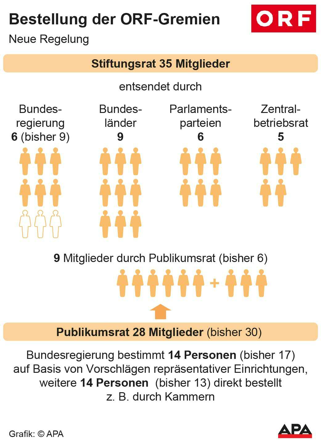 Der Publikumsrat wird auf 28 Mitglieder etwas verkleinert. Die Hälfte davon wird von der Regierung entsendet - bisher wurden 17 Personen vom Bundeskanzler bzw. Medienminister bestimmt. Die Regierung hat dafür Dreiervorschläge von Organisationen, die für einen gewissen Bereich wie Bildung, Sport oder Jugend repräsentativ sind, einzuholen. Neue Regelungen gelten, sollten Organisationen keine Dreiervorschläge einreichen, sondern lediglich eine Person nennen, was in der Vergangenheit wiederholt vorkam.