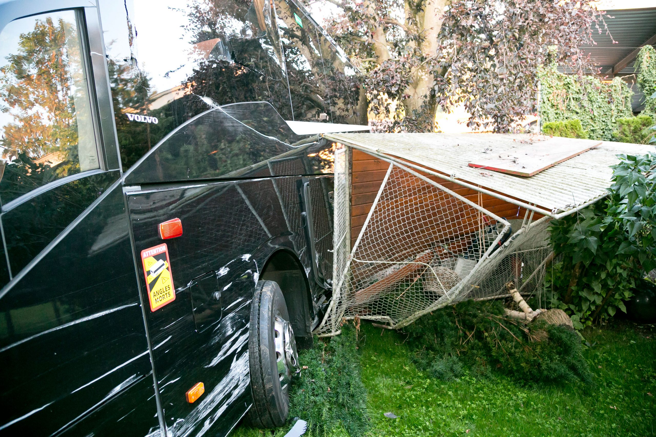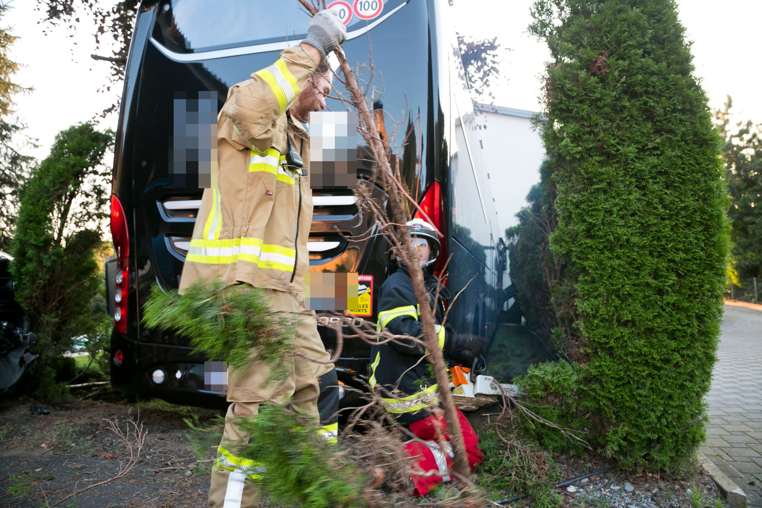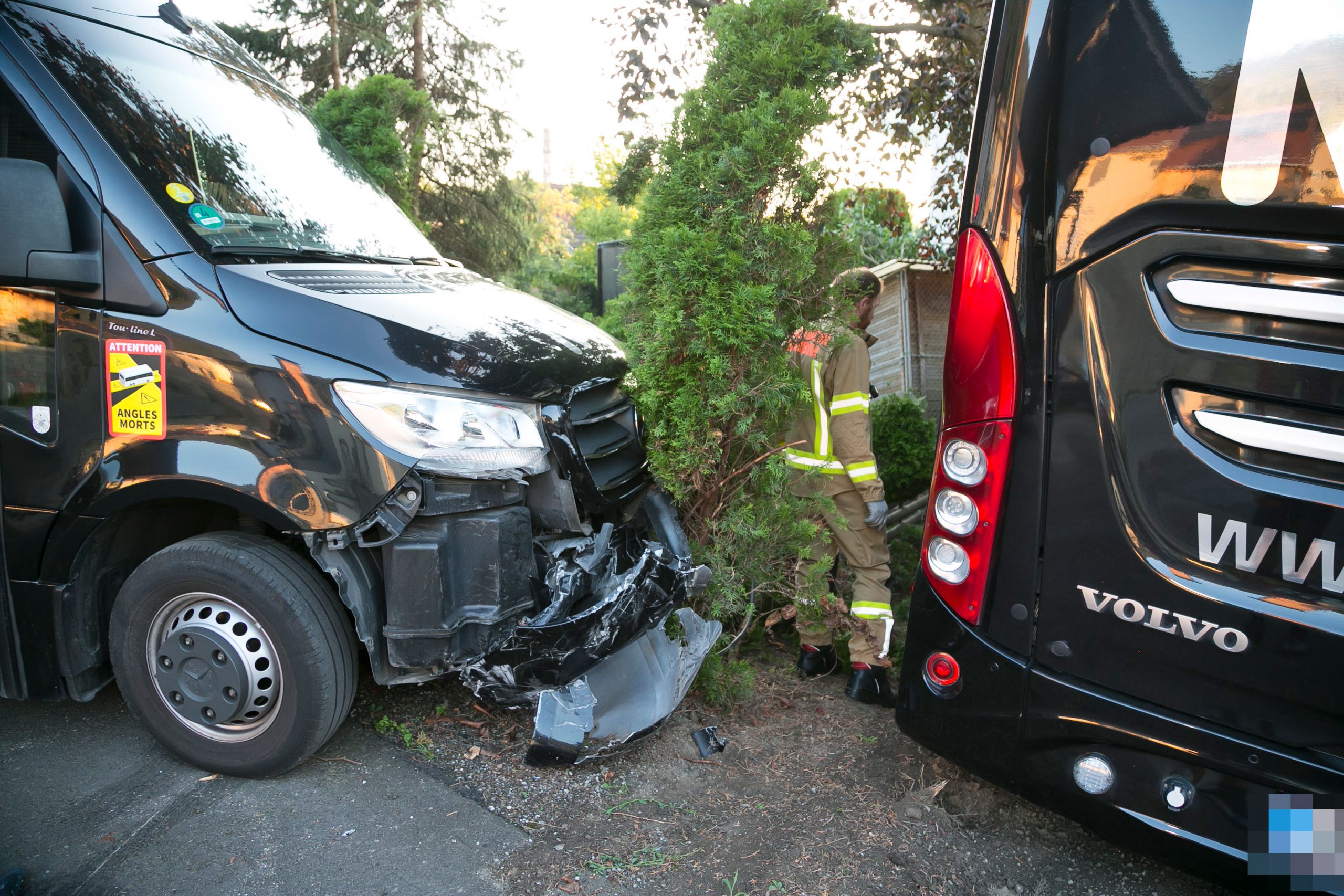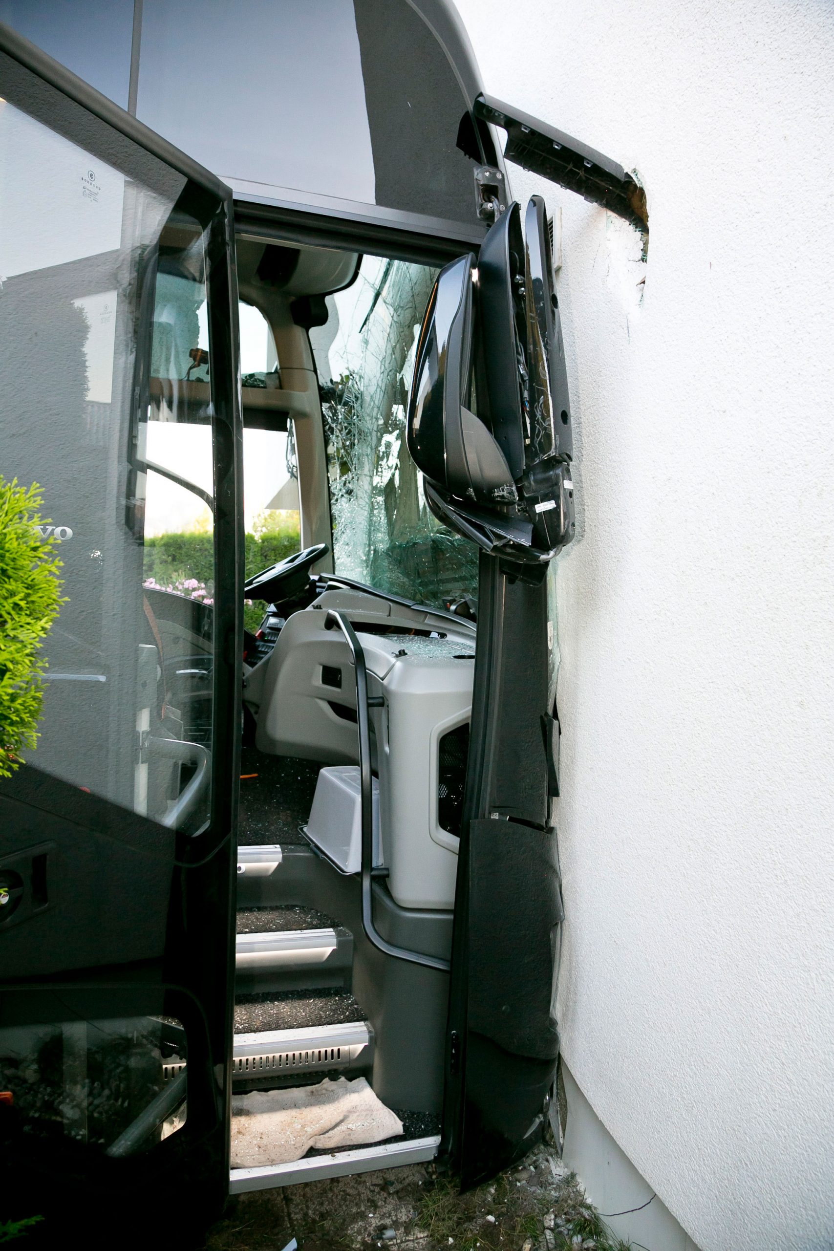 Der Reisebus prallte frontal gegen einen geparkten Transporter, durchbrach eine Gartenhecke und stieß schließlich gegen die Außenwand eines Wohnhauses. Der Bus, der Transporter, die Hecke und die Hausfassade wurden dabei erheblich beschädigt.