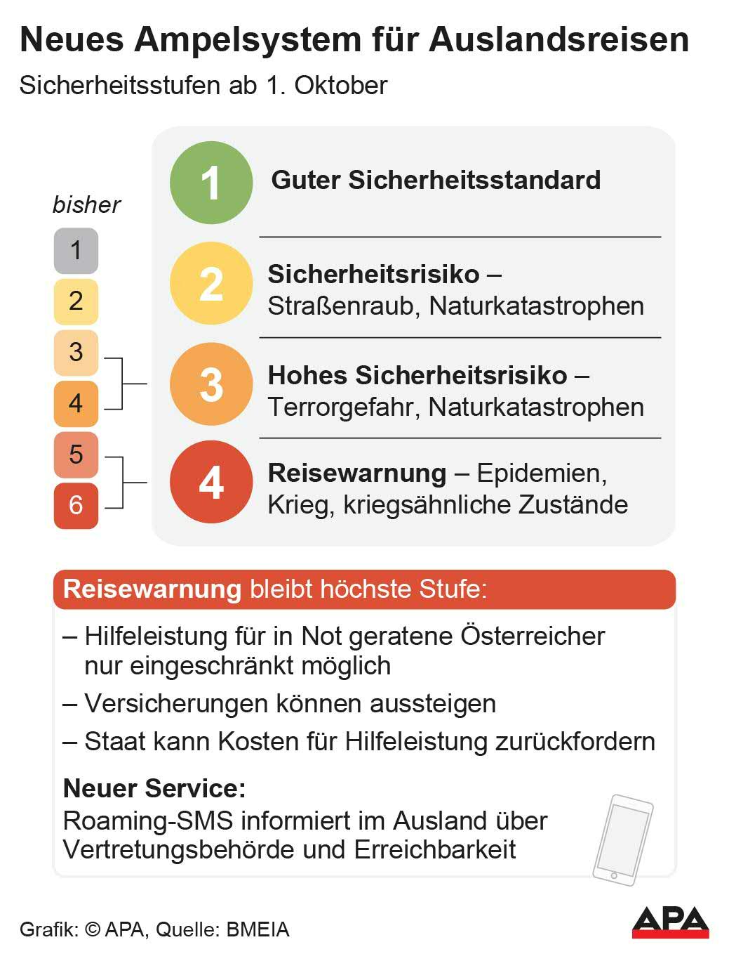 Das Außenministerium stellt mit 1. Oktober sein System der Reiseinformationen um: Wie in vielen anderen Ländern wird es künftig ein "Ampelsystem" mit vier Stufen geben statt der bisherigen sechs. Neu ist auch, dass regionale Unterschiede innerhalb einzelner Staaten mittels Landkarten ausgewiesen werden. Ein Beispiel dafür ist Ägypten, wo es gelbe, orange und rote Regionen gibt. Zudem sollen Roaming-SMS künftig die Kontaktdaten der zuständigen Botschaft enthalten.