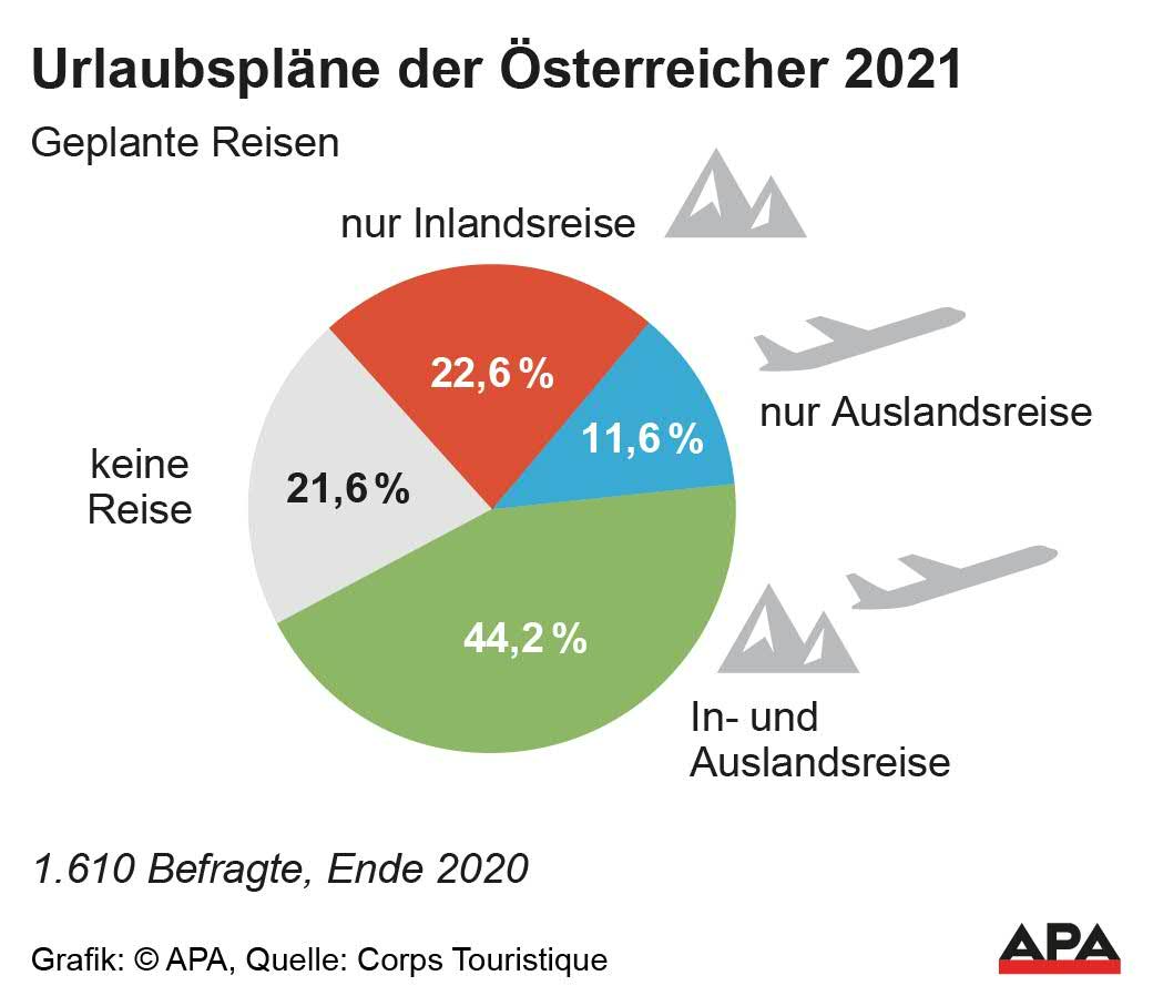 78 Prozent von über 1.600 Befragten über 18 Jahre planen heuer eine private Reise, mehr als die Hälfte davon würde gerne ins Ausland auf Urlaub fahren. Unter jenen, die gar nicht verreisen wollen, überwiegen Sorgen wegen Corona bzw. damit zusammenhängende schlechte Planbarkeit, ergab eine Umfrage des Corps Touristique in Österreich.