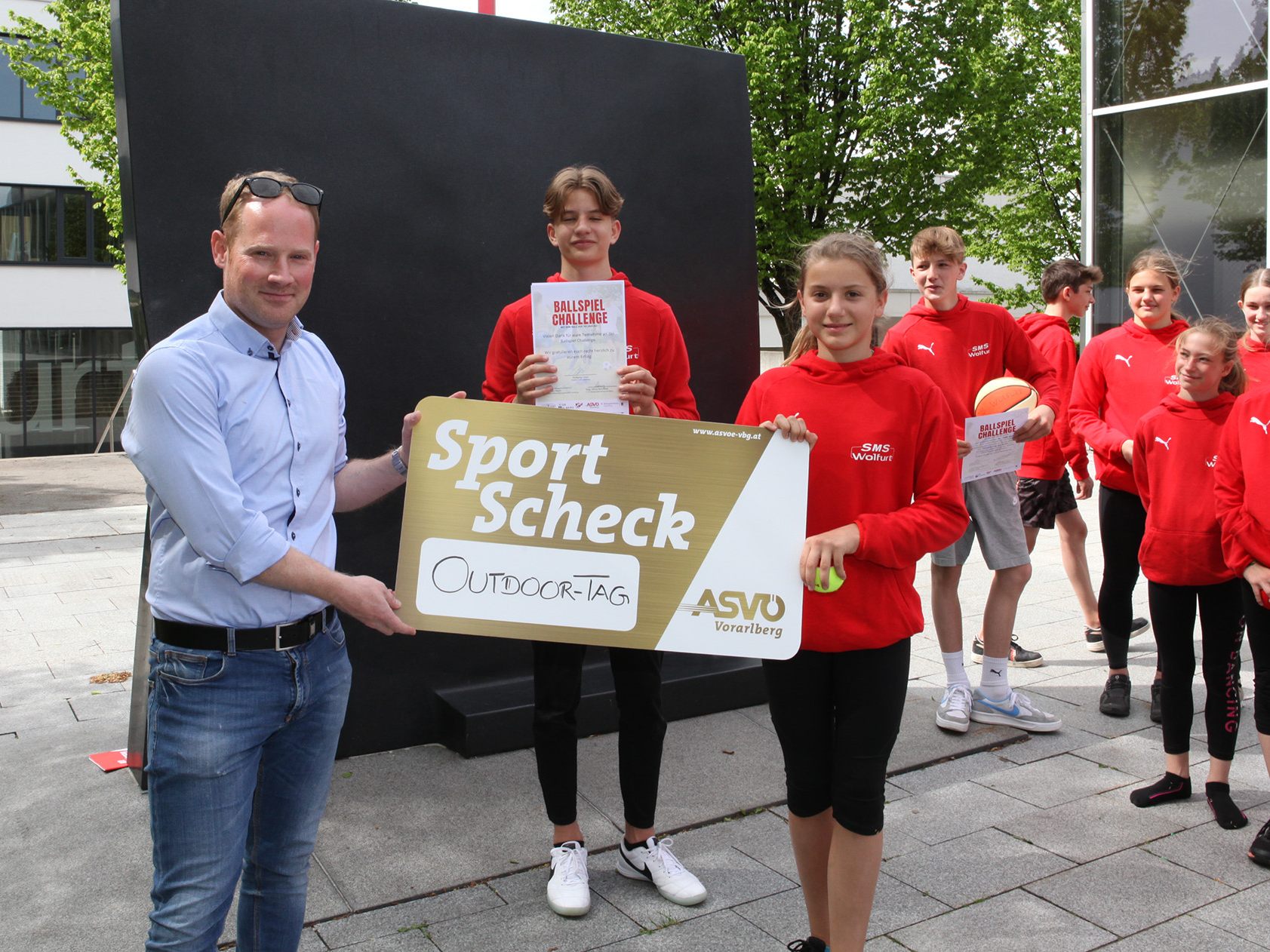 Die Preisverleihung für die Ballspiel-Challenge mit den Organisatoren Conny Berchtold und Christoph Neyer vom Schulsportreferat Vorarlberg, Clemens Fiel vom ASVÖ Vorarlberg und Christian Lampert von der Marke Vorarlberg fand vor Kurzem bei den siegreichen Schulen statt. Die zwei Klassen 2a und 4 a der Sportmittelschule Wolfurt erreichte die höchste Punkteanzahl. Mit der Sportmittelschule Bregenz Schendlingen (4a) hat eine zweite Schule alle zu vergebenen Zähler erreicht. Die Marke Vorarlberg stellte mit einem Gratis Outdoor-Tag am Golm den Hauptpreis zur Verfügung. Siegerteam bei den Regelschulen war das Bundesoberstufenrealgymnasium Feldkirch vor der Freien Montessorischule Altach. Platz drei ging an die Mittelschule Wolfurt. Platz eins bei den Oberstufen Polytechnischen Schule ging nach Hittisau (Klasse 9b). Im Juni folgt der dritte Streich einer neuen Challenge: Die Uniqa Jonglier-Challenge mit sieben anspruchsvollen Übungen stehen auf dem Programm.