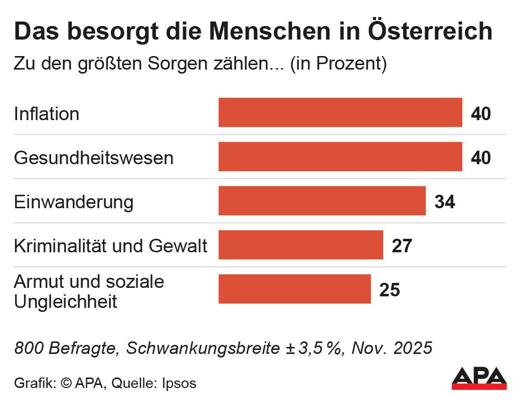 Die wirtschaftliche Lage im Land wirke sich aber zunehmend auf den Gemütszustand der Österreicher aus. Armut und soziale Ungleichheit (25 Prozent; plus vier Prozentpunkte) und auch Arbeitslosigkeit (15 Prozent; plus zwei Prozentpunkte) bereiten vielen Sorgen.