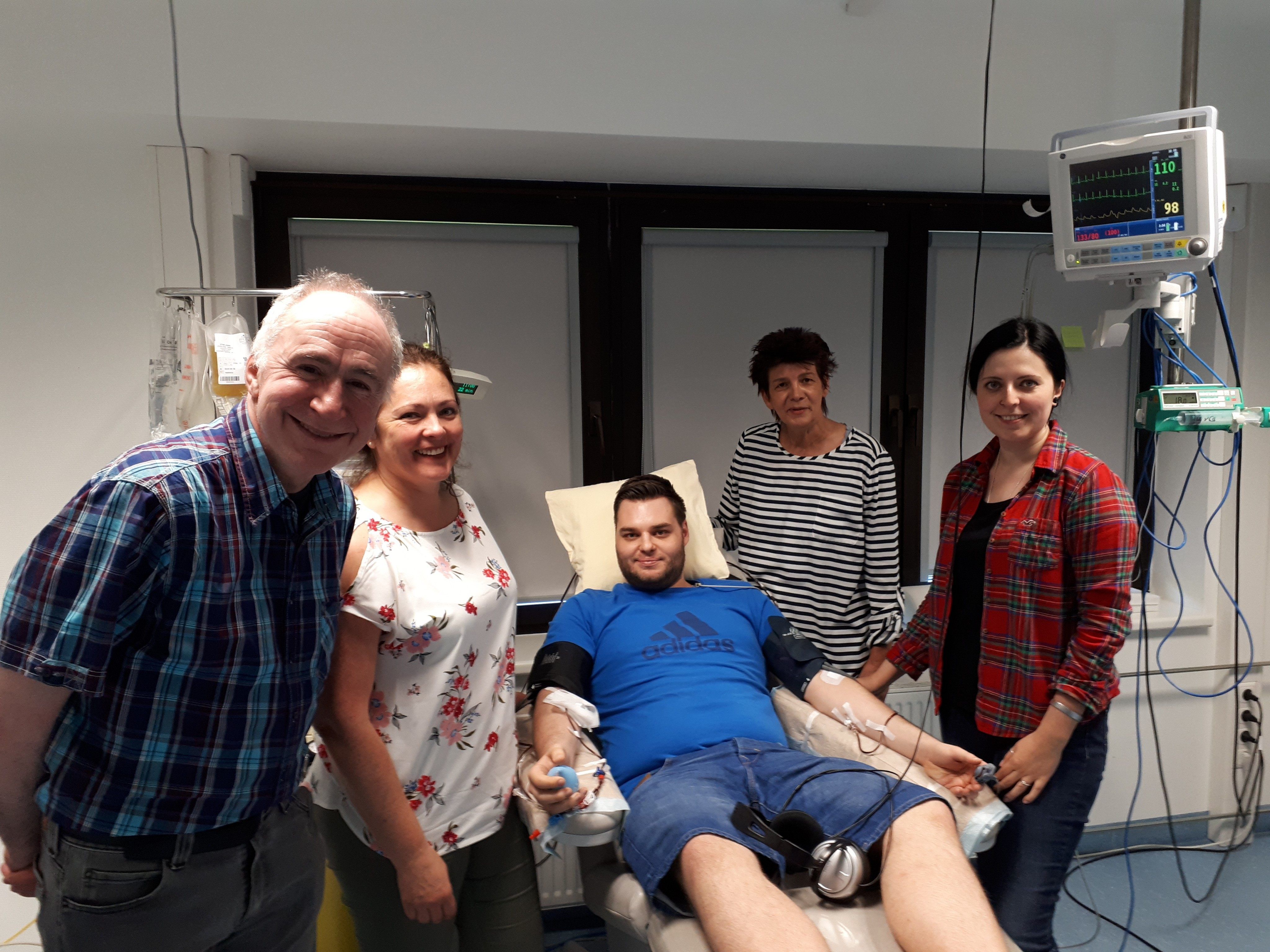 Bei der Vorbereitung hatte er einen Tag lang Rückenschmerzen, die er nach der Einnahme einer Tablette aber schnell im Griff hatte. Am 22. Mai fuhr er zusammen mit Phillip (unserem 69. Spender) und dessen Schwester nach Gauting zu unserem Partner AKB, wo er “sensationell betreut wurde.”