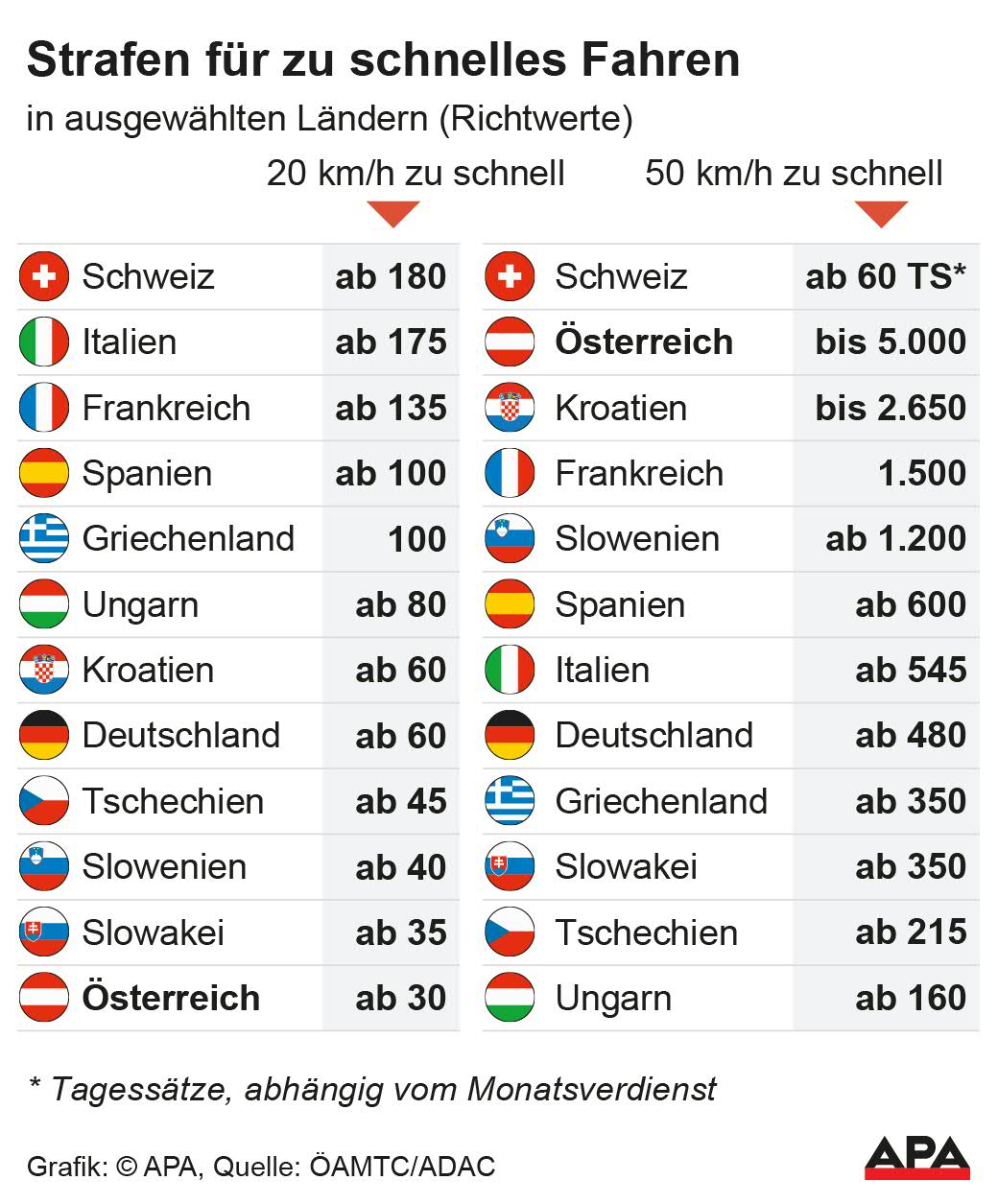 Bei 50 km/h zu viel gehen die Strafrahmen und Mindesthöhen noch deutlicher auseinander. Während in so einem Fall von Raserei in Ungarn beispielsweise ab 160 Euro zu bezahlen sind, sind es in Italien bereits mindestens 545 Euro, in Spanien ab 600 und in Slowenien ab 1.200 Euro. In der Schweiz müssen einkommensabhängig ab 60 Tagsätzen bezahlt werden, in Kroatien sind es bis zu 2.650 Euro und in Österreich maximal 5.000 Euro.