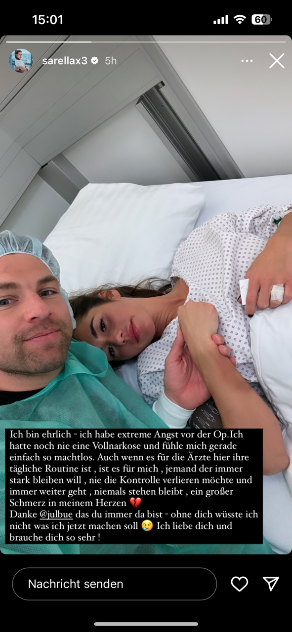 Die Sorge und Angst vor dem bevorstehenden Eingriff teilte Engels ebenfalls mit ihren Followern. "Ich bin ehrlich – ich habe extreme Angst vor der OP", schrieb sie zu einem Bild aus dem Krankenbett, auf dem ihr Ehemann Julian ihr zur Seite steht und ihr Halt gibt. Sie beschreibt ihre Gefühle und die Herausforderung, die diese Situation für sie darstellt, als jemand, der immer stark sein möchte und nie die Kontrolle verlieren will.