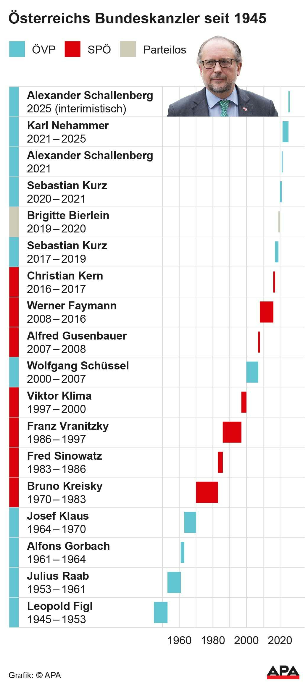 Es ist Schallenbergs zweite Amtszeit an der Regierungsspitze. Schon 2021 hatte er gut zwei Monate als Bundeskanzler gedient - nämlich zwischen dem Rückzug von Sebastian Kurz und der Installierung von Nehammer, dessen Vorgänger und Nachfolger er damit in einem ist.