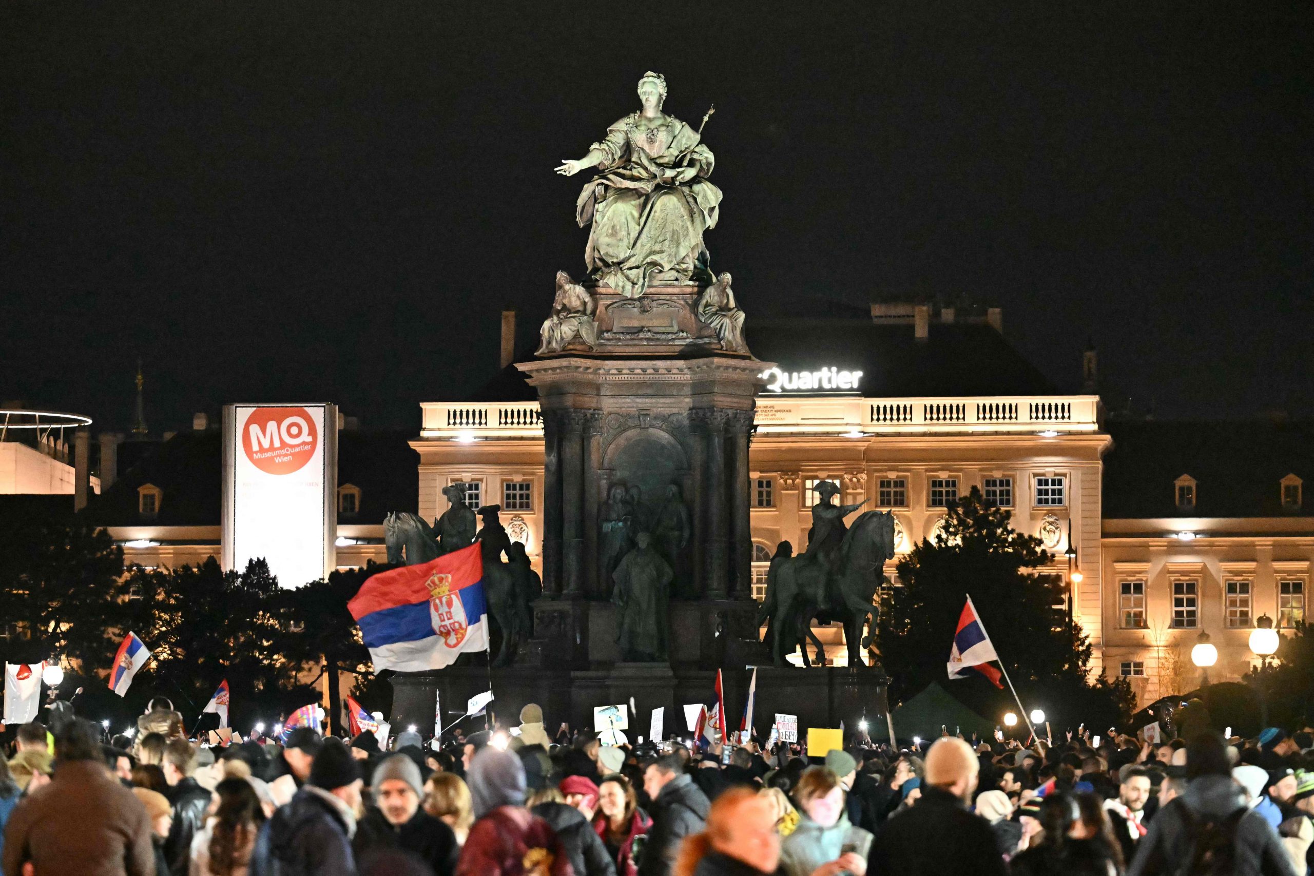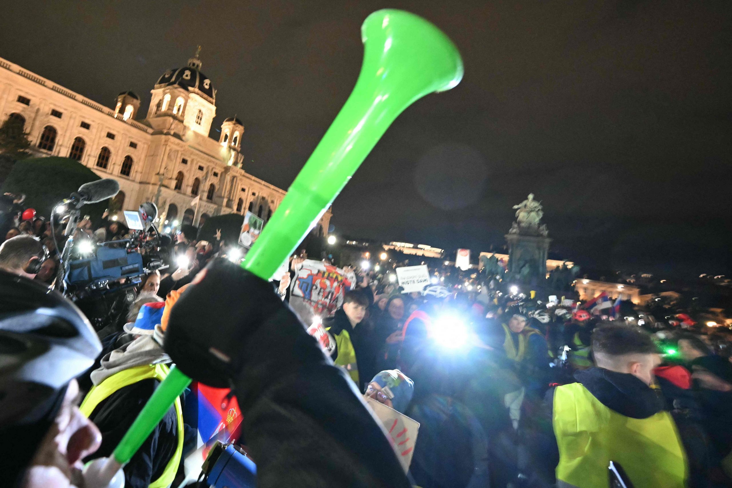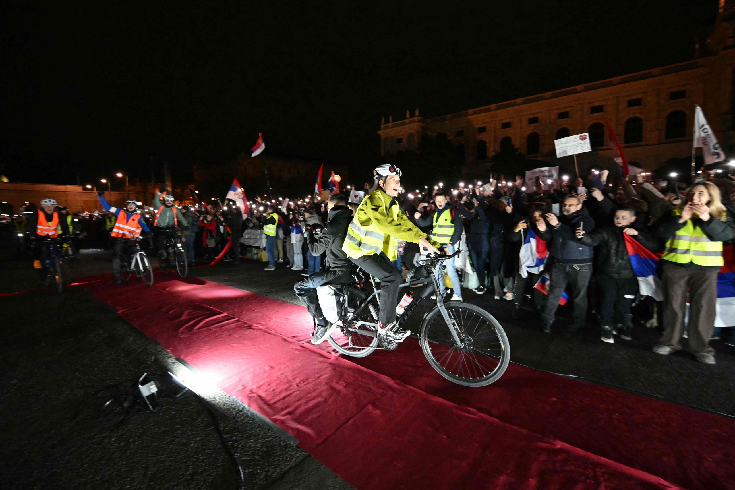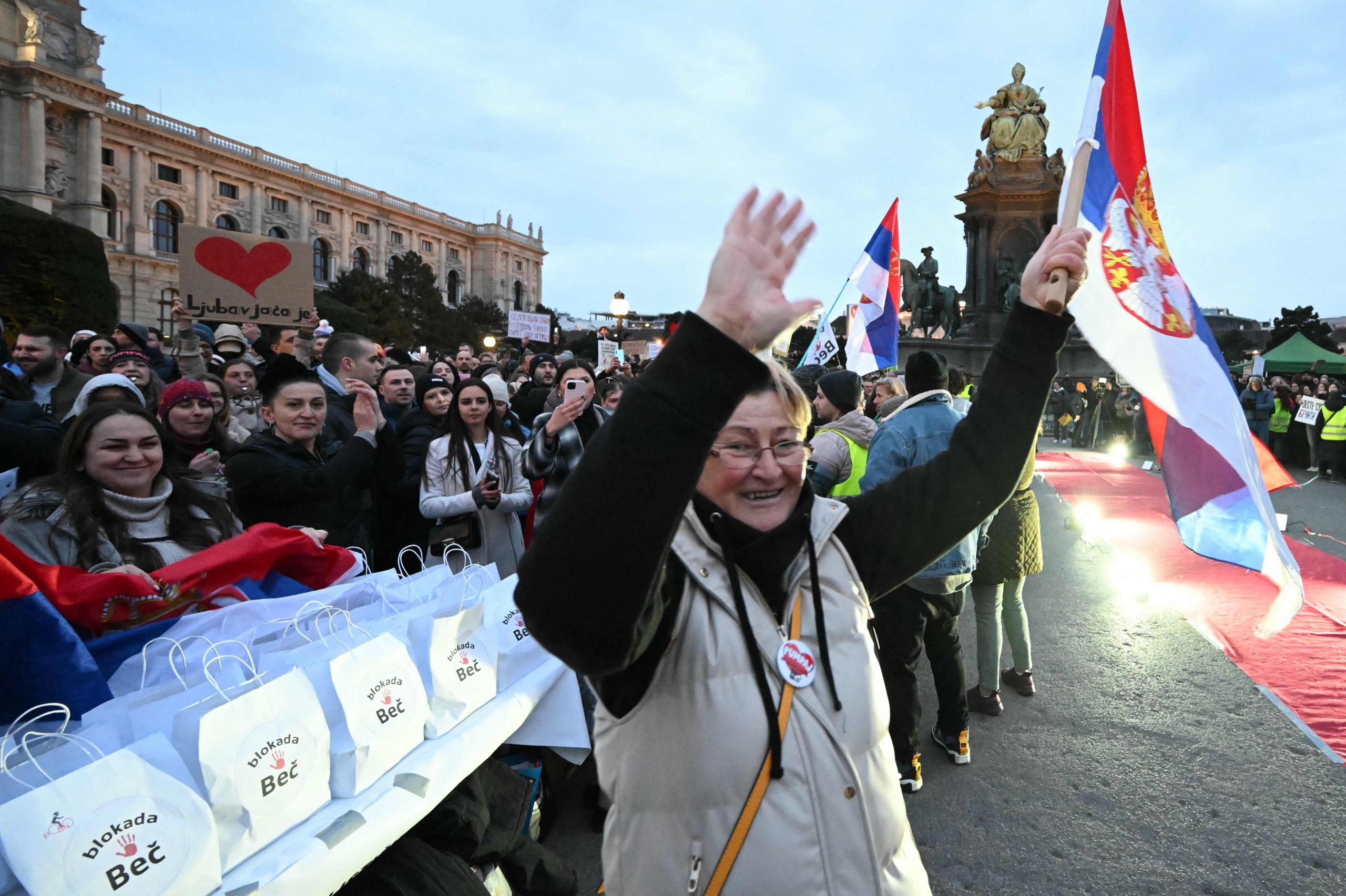 Trotz der verspäteten Ankunft herrschte am Maria-Theresien-Platz ausgelassene Stimmung. Serbische Musik tönte aus den Lautsprechern, auf dem roten Teppich wurde getanzt. Als die Gruppe eintraf, ertönten "Pumpaj"-Rufe – der Schlachtruf der Bewegung – begleitet von einem Meer aus Handyscheinwerfern. Manche Radler trugen serbische Fahnen, eine Ikone oder ein Pikachu-Kuscheltier.