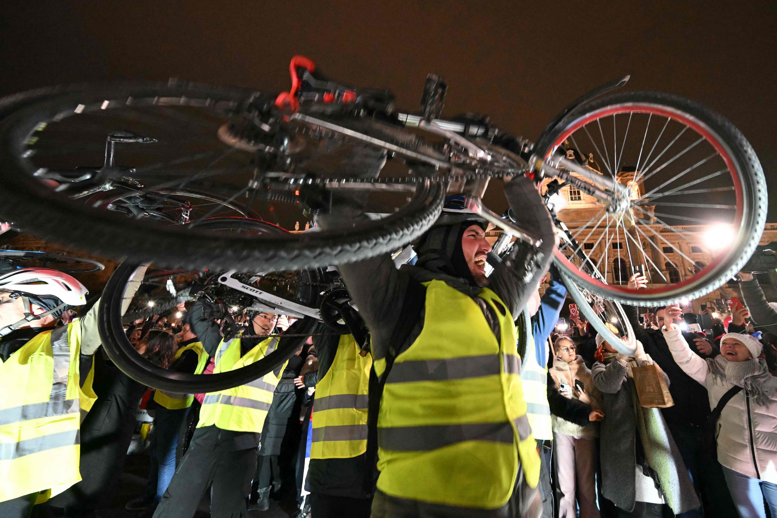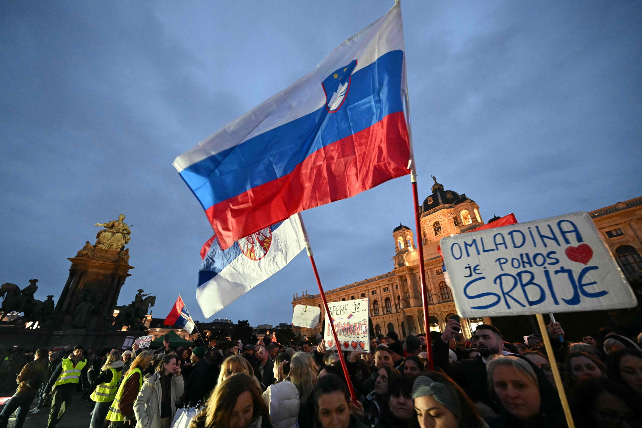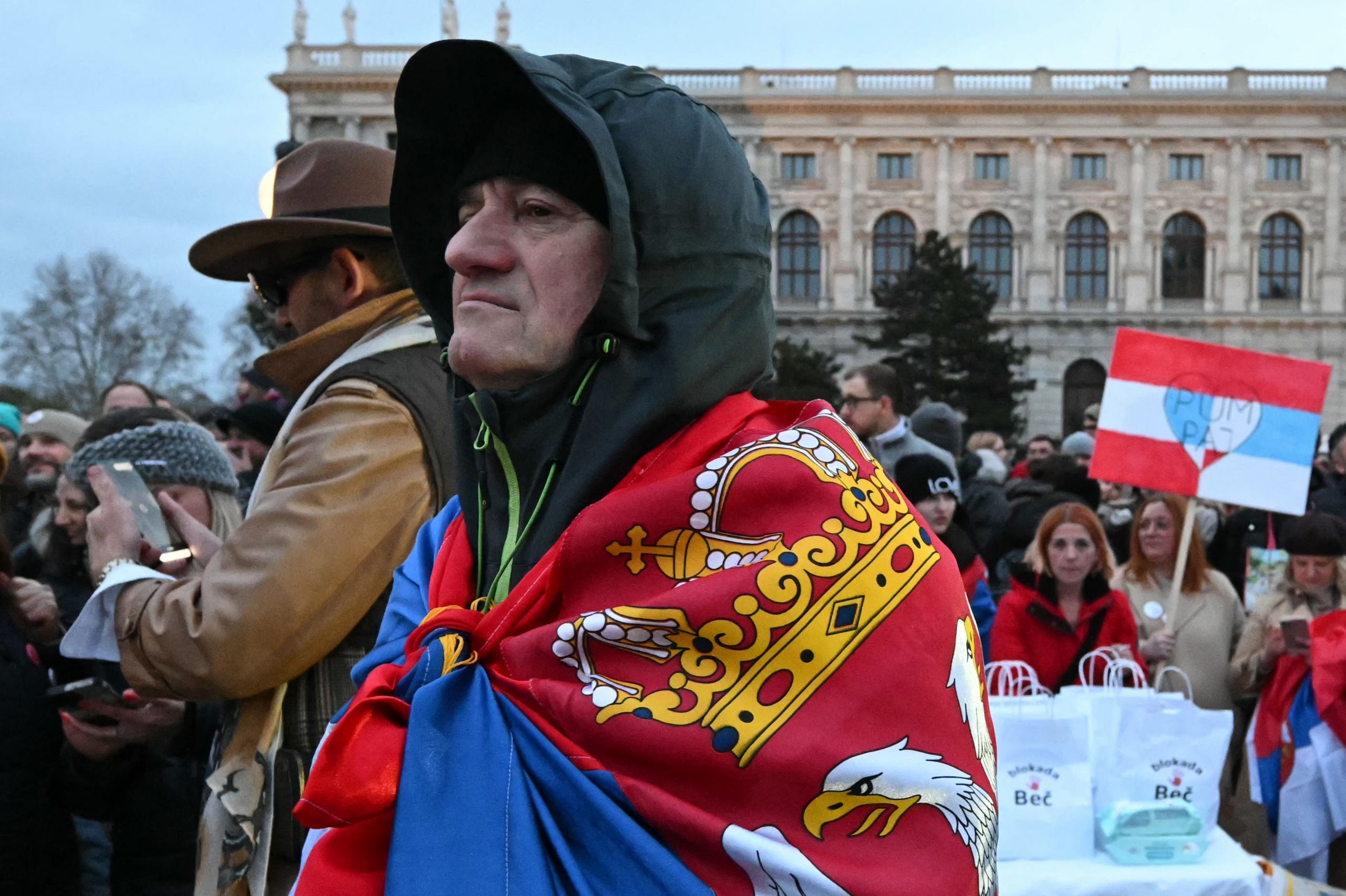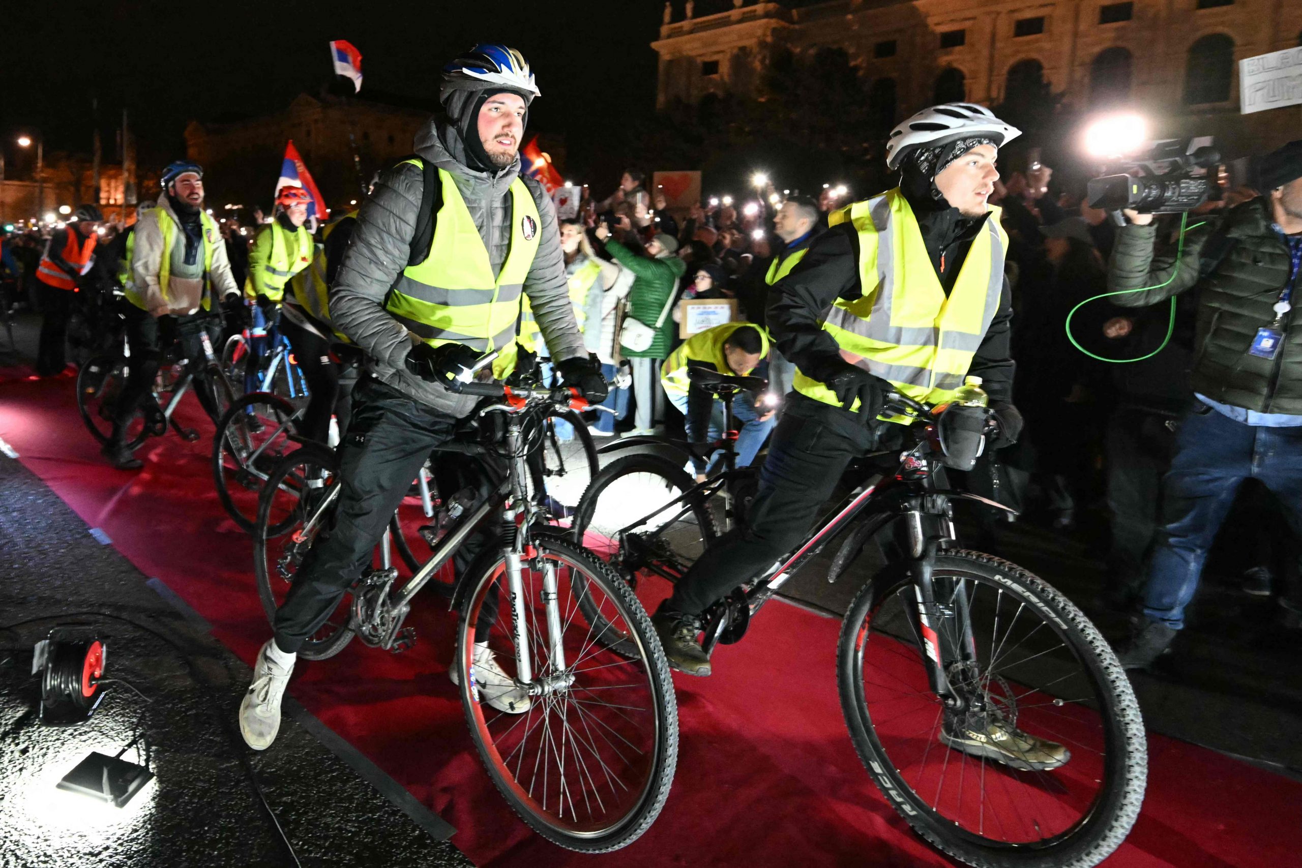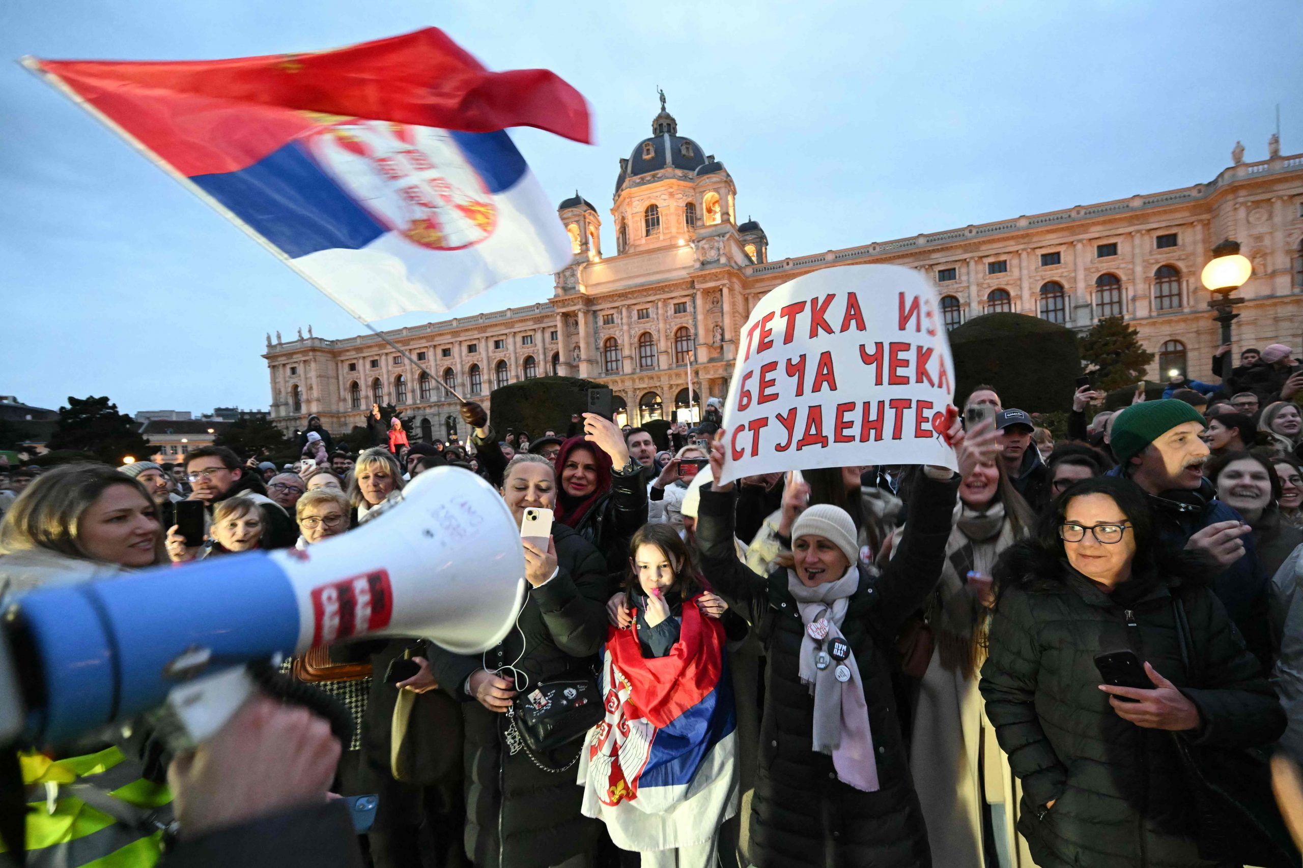 Trotz der verspäteten Ankunft herrschte am Maria-Theresien-Platz ausgelassene Stimmung. Serbische Musik tönte aus den Lautsprechern, auf dem roten Teppich wurde getanzt. Als die Gruppe eintraf, ertönten "Pumpaj"-Rufe – der Schlachtruf der Bewegung – begleitet von einem Meer aus Handyscheinwerfern. Manche Radler trugen serbische Fahnen, eine Ikone oder ein Pikachu-Kuscheltier.